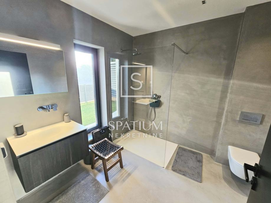 U dvorištu se nalazi bazen od površine 52m2 sa slanom vodom, hidromasažom, opremljen sustavom grijanja putem zasebne dizalice topline te automatskim pokrovom. Okućnica je u potpunosti uređena i održavana, s ugrađenim automatskim sustavom navodnjavanja, a cijela parcela osigurava visoku razinu privatnosti.