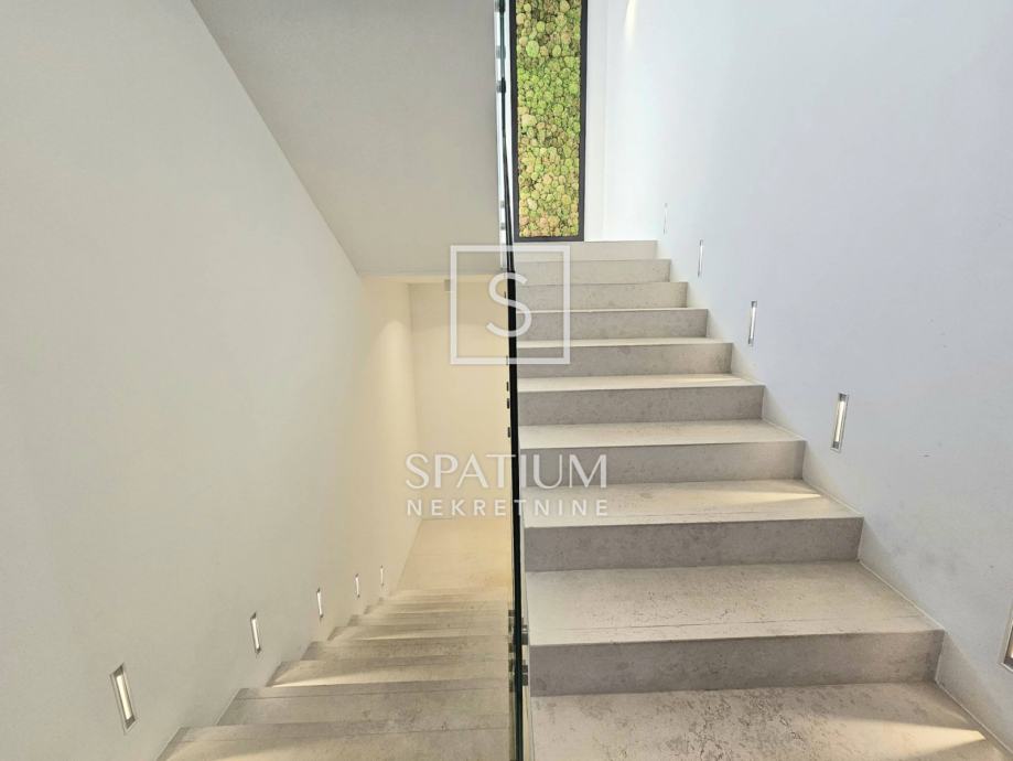 Kuća je kompletno opremljena podnim grijanjem putem dizalice topline, dok je za hlađenje predviđen sustav fan-coil jedinica. Implementiran je i pametni sustav upravljanja, koji omogućuje kontrolu ulaza, roleta u sobama te velikih zavjesa u dnevnom boravku putem mobilne aplikacije. Sigurnost nekretnine osigurana je alarmnim i video nadzornim sustavom.