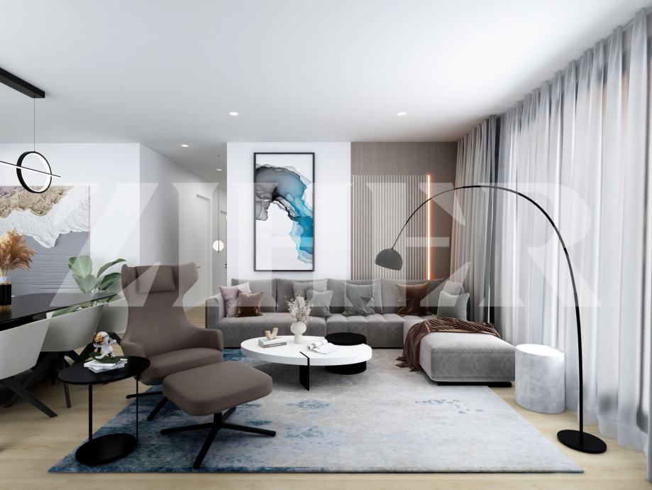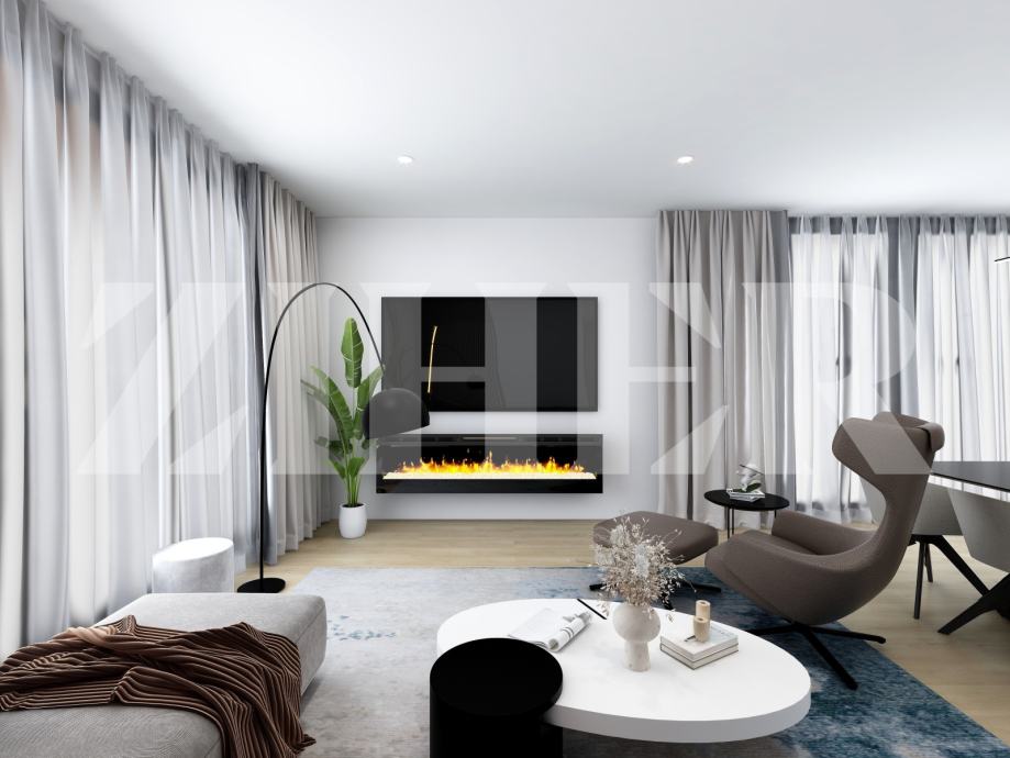 Wih Top-quality equipment, first-class three-layer oak parquet, first-class Italian ceramic tiles of larger sizes, underfloor heating in the entire apartment via a heat pump, and all rooms are air-conditioned (living room and bedroom).