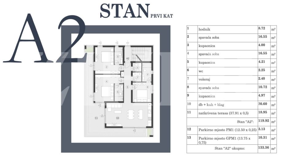 Prvi kat - Stan A2 se sastoji od ulaznog hodnika, dnevnog boravka s blagavaonicom i kuhinjom, tri spavaće sobe koja svaka ima svoju kupaonicu, vešeraja i wc-a, ukupne površine 101 m2 + 38 m2 natkrivene terase + 1 vanjsko parkirno mjesto + 1 garažno parkirno mjesto = ukupna cijena 493.000 eura