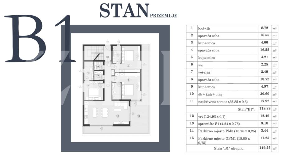 Prizemlje - Stan B1 se sastoji od ulaznog hodnika, dnevnog boravka s blagavaonicom i kuhinjom, tri spavaće sobe koja svaka ima svoju kupaonicu, vešeraja i wc-a, ukupne površine 101 m2 + 36 m2 natkrivene terase + vrt od 125 m2 + spremište 4 m2 + 1 vanjsko parkirno mjesto + 1 garažno parkirno mjesto = ukupna cijena 550.000 eura