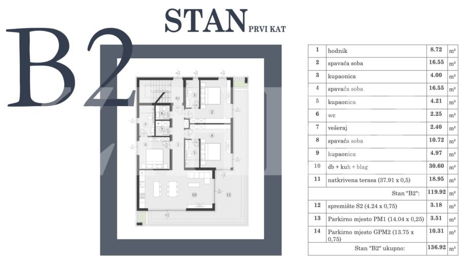 Prvi kat - Stan B2 se sastoji od ulaznog hodnika, dnevnog boravka s blagavaonicom i kuhinjom, tri spavaće sobe koja svaka ima svoju kupaonicu, vešeraja i wc-a, ukupne površine 101 m2 + 38 m2 natkrivene terase + spremište 4 m2 + 1 vanjsko parkirno mjesto + 1 garažno parkirno mjesto = ukupna cijena 505.000 eura