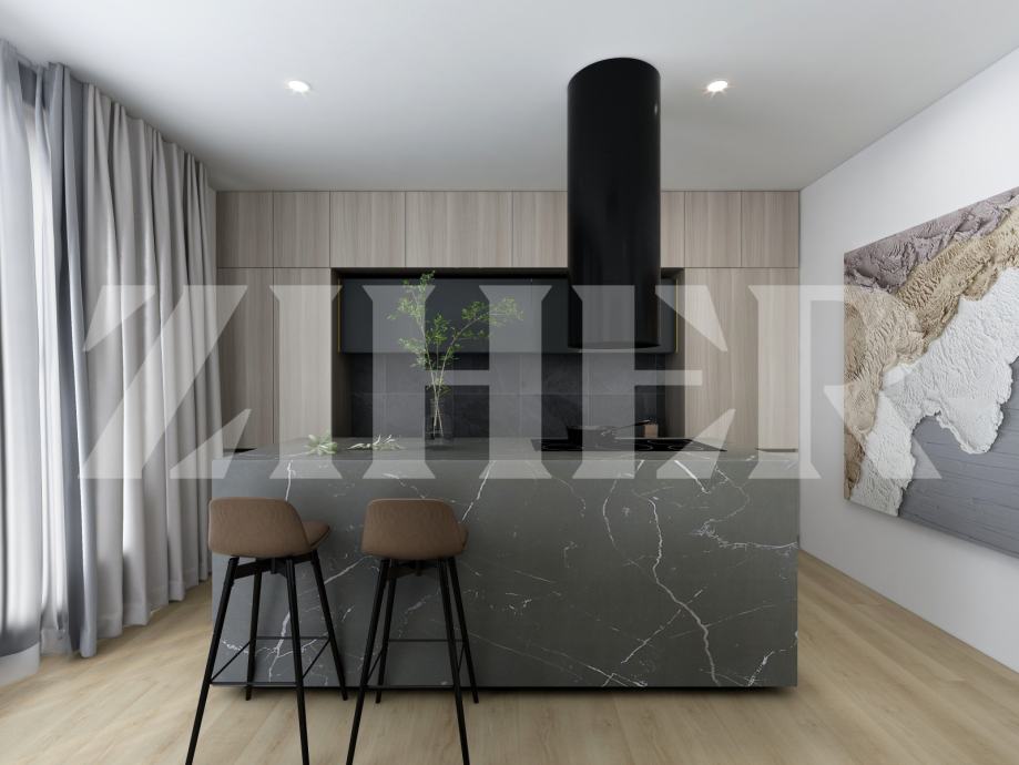 Wih Top-quality equipment, first-class three-layer oak parquet, first-class Italian ceramic tiles of larger sizes, underfloor heating in the entire apartment via a heat pump, and all rooms are air-conditioned (living room and bedroom).