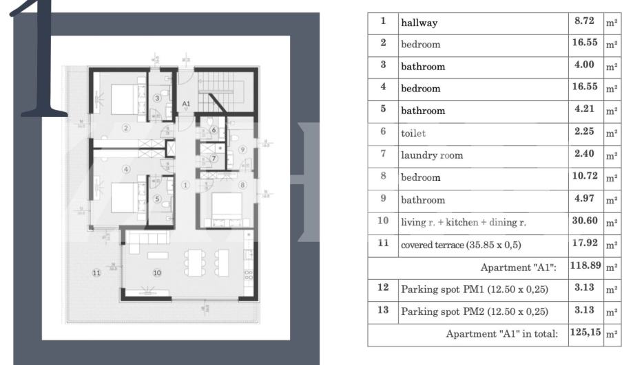 Prizemlje - Stan A1 se sastoji od ulaznog hodnika, dnevnog boravka s blagavaonicom i kuhinjom, tri spavaće sobe koja svaka ima svoju kupaonicu, vešeraja i wc-a, ukupne površine 101 m2 + 36 m2 natkrivene terase + vrt od 150 m2 + 2 vanjska parkirna mjesta = ukupna cijena 450.000 eura