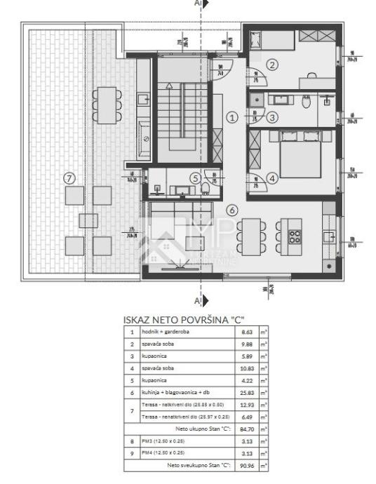- Kuhinju otvorenog koncepta s dnevnim boravkom i blagovaonicom, s izlazom na veliku terasu (dio natkriven, dio otvoren)