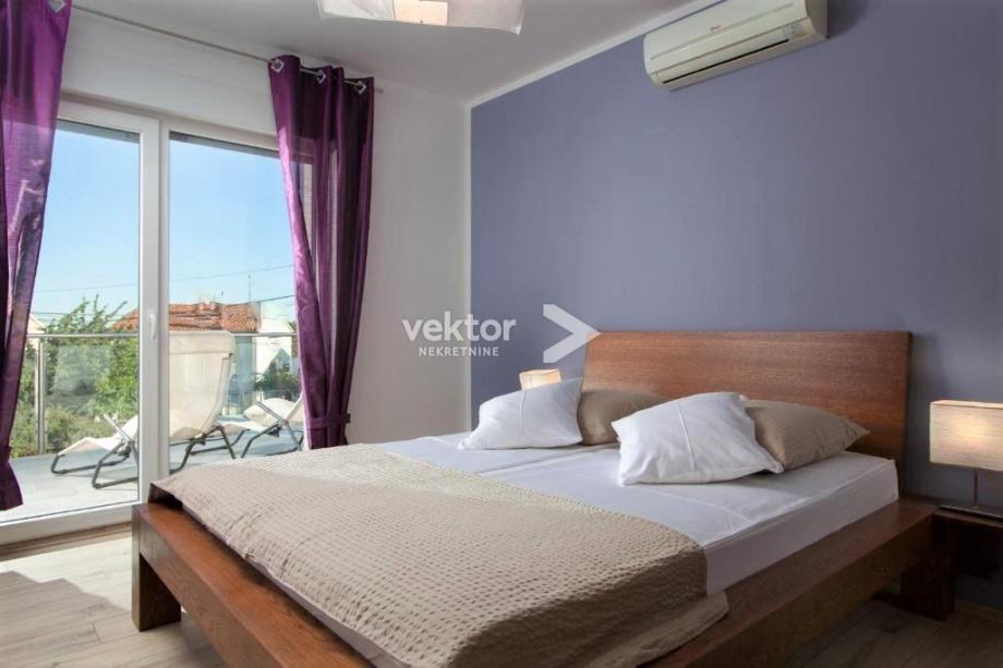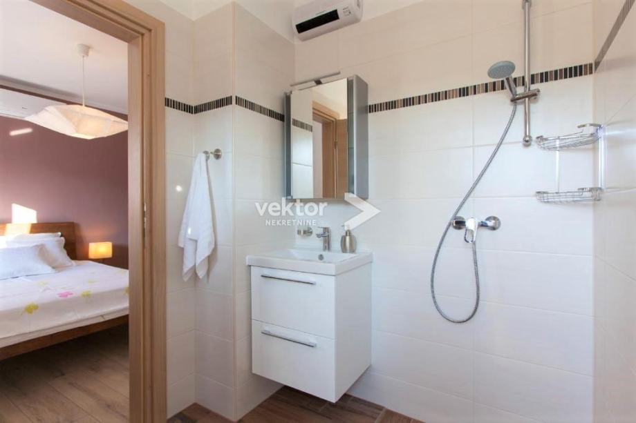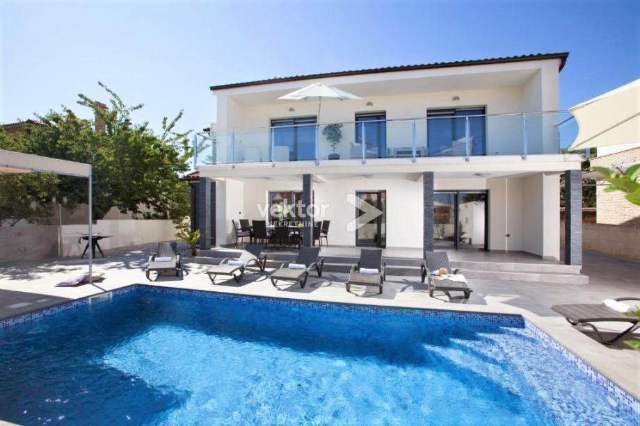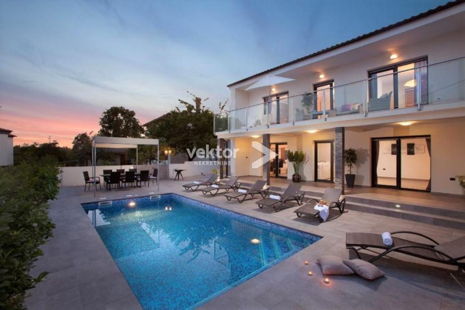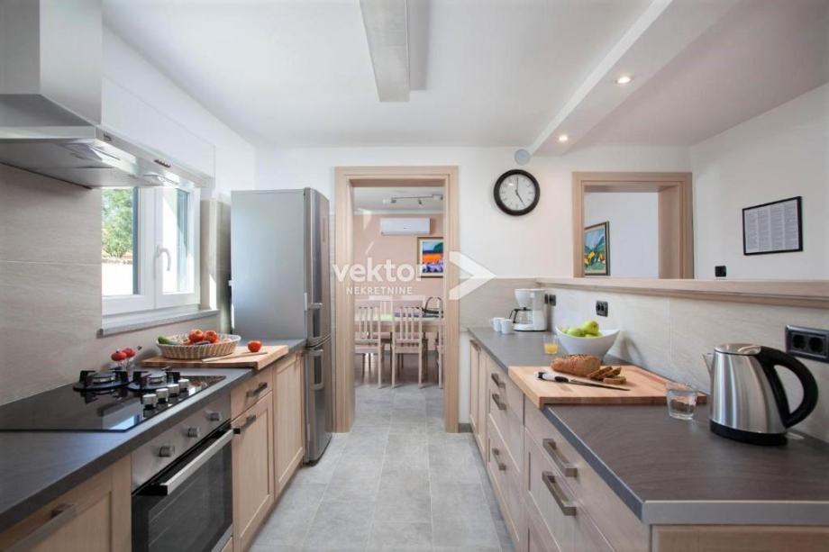 Prizemlje zauzima velika kuhinja, blagovaonica i dnevni boravak koji je opremljen kao kutak za odmor i druženje. Na gornjem katu se nalaze četiri spavaće sobe i tri kupaonice. Iz soba se izlazi na balkon, a prizemlje ima izlaz na natkrivenu terasu na koju se nadovezuje sunčalište i bazen.