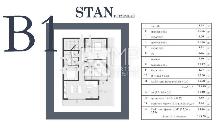 Predmetna nekretnina nalazi se u prizemlju zgrade B, oznake "B1", ukupne površine 118,89 m2, a sastoji se od: hodnika,db+kuhinje+blagovaonice, 3 spavaće sobe od kojih svaka ima svoju kupaonicu, vešeraja, te dodatnog wc-a i natkrivene terase.