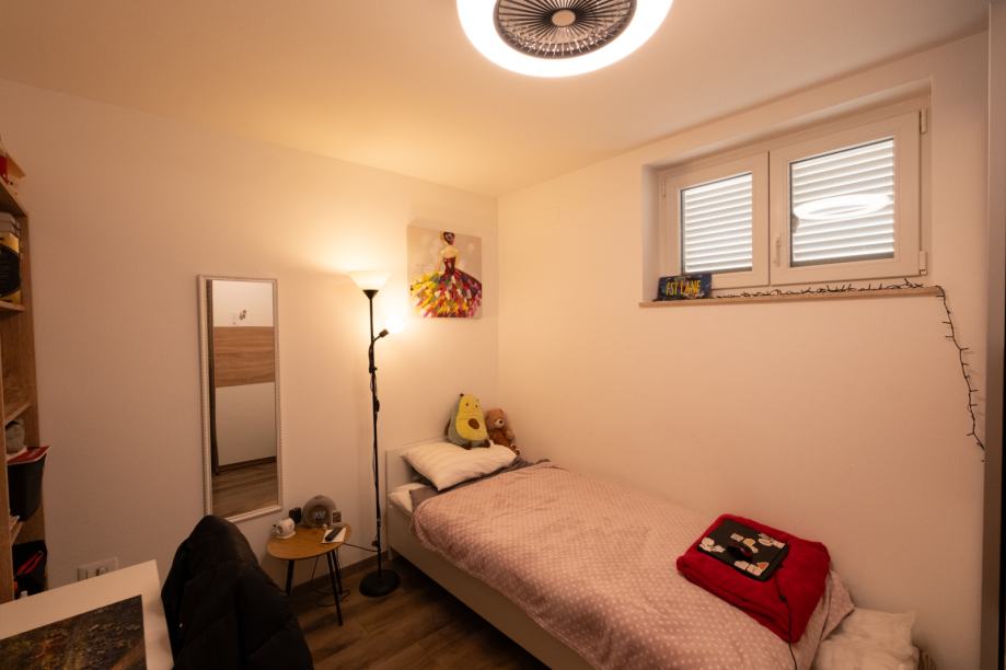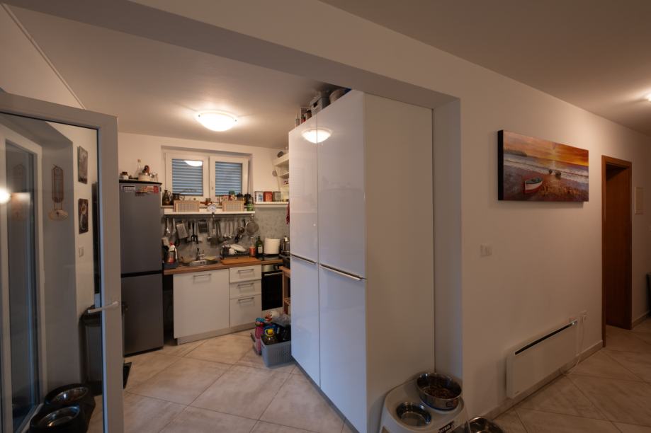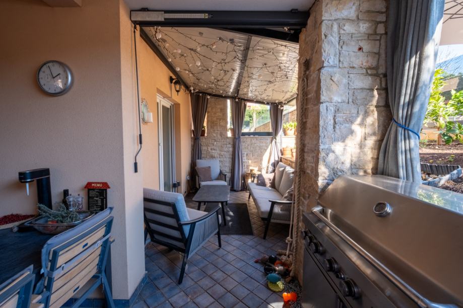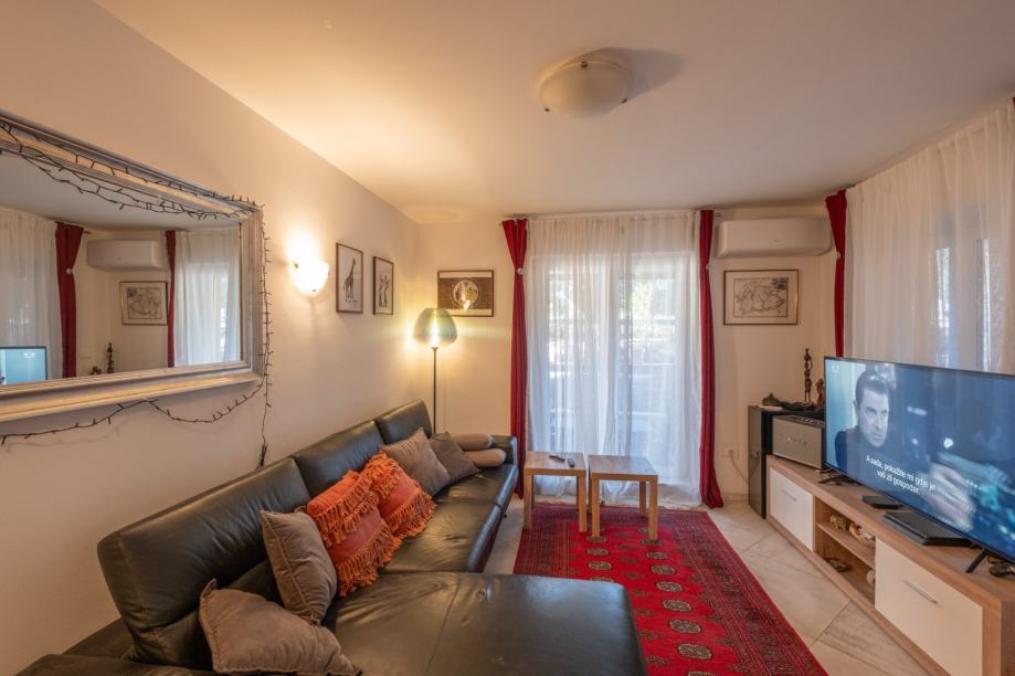 Ovaj noviji stan je smješten u nižem prizemlju (samo tri stana u ulazu) sa lijepom pripadajućom natkrivenom terasom i vrtom (ograđeno i sa diskretnom rasvjetom), dvije spavaće sobe, dnevni boravak s kuhinjom i prostorom za ručavanje, kupatilo, dva zasebna ulaza, parkirno mjesto u vlasništvu, namješteno i opremljeno, vlastiti izlaz na zajednički bazen i prostor za sunčanje, klimatiziran, nordijski radijatori, optički INTERNET,... Mora se vidjeti.