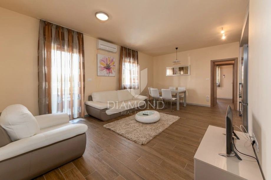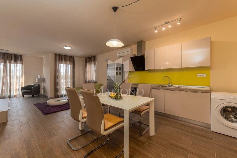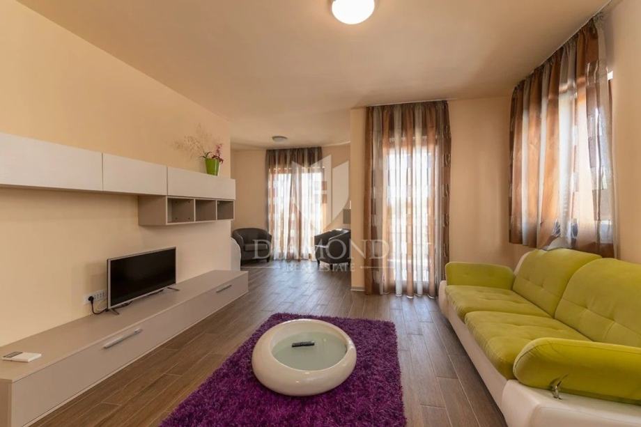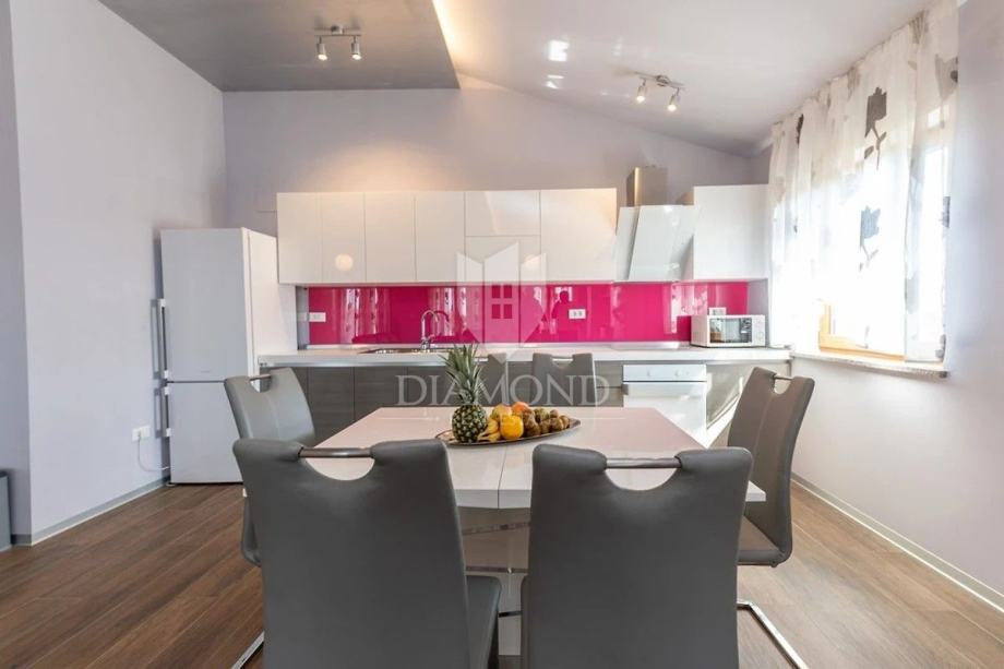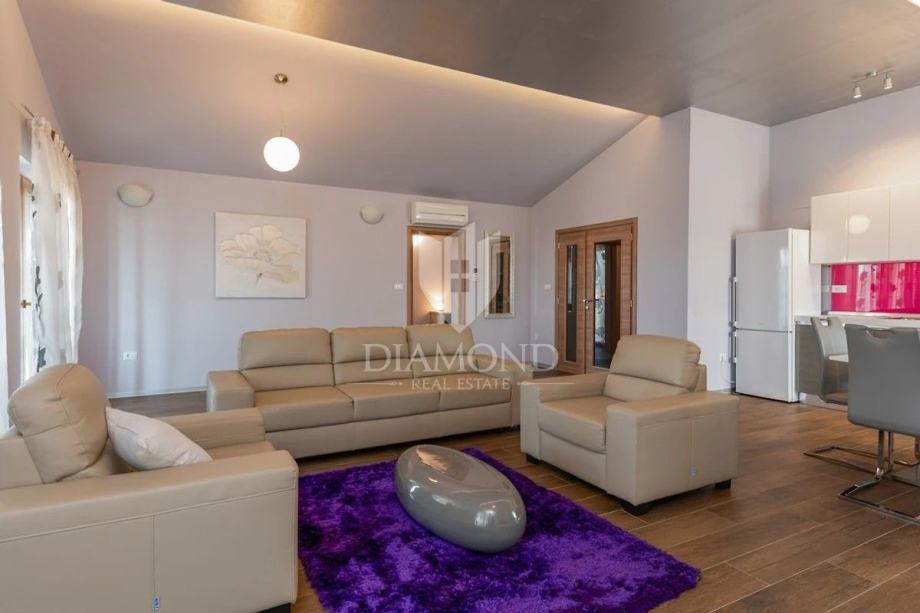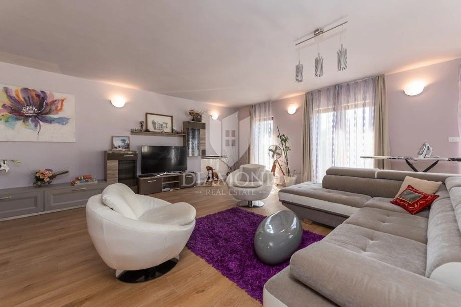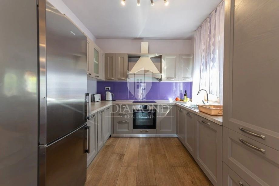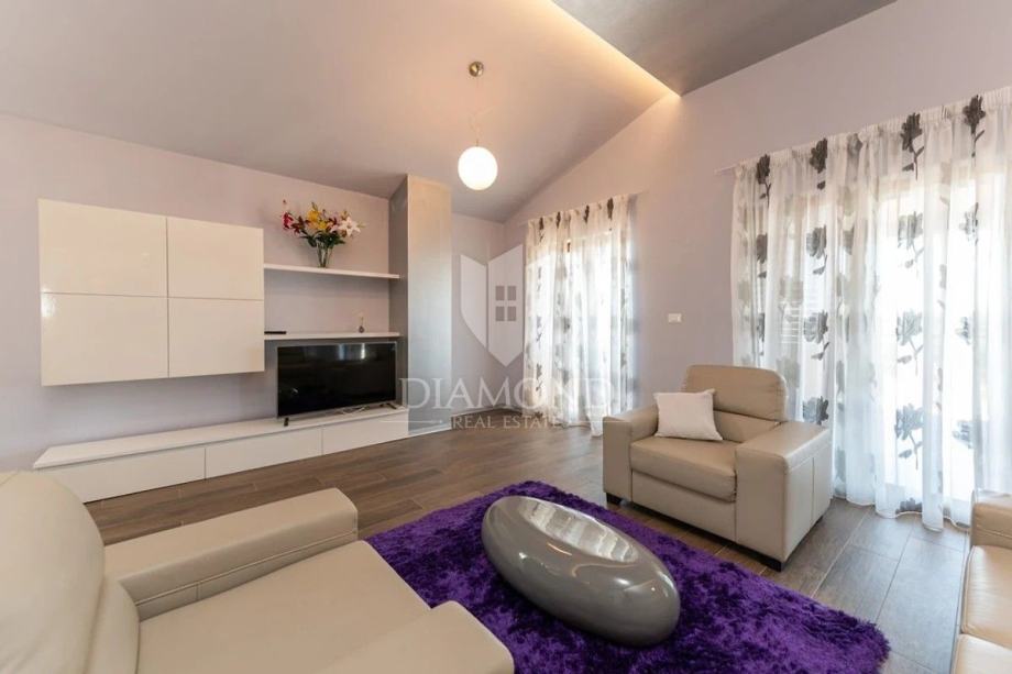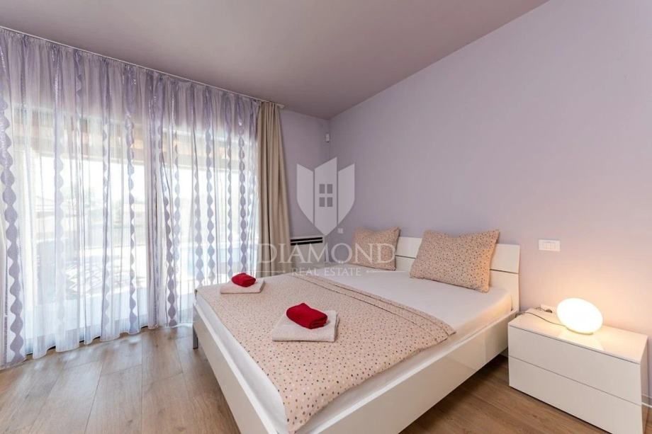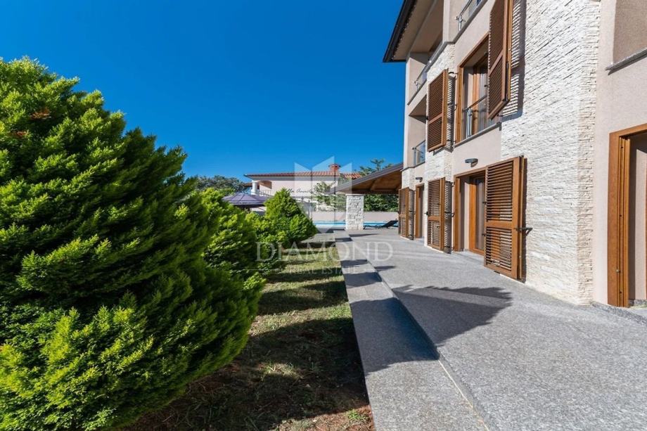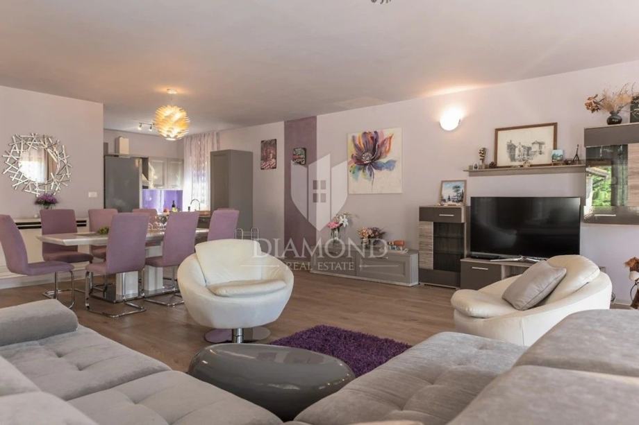 Na cijeloj prvoj etaži nalazi se stan koji se sastoji od prostranog dnevnog boravka povezanog s kuhinjom i blagovaonom te dnevni boravak ima i izlaz na bazen, vešeraj ,kupatilo i tri spavaće sobe od koji jedna spavaća soba ima svoj wc.