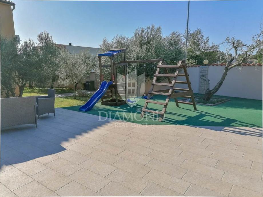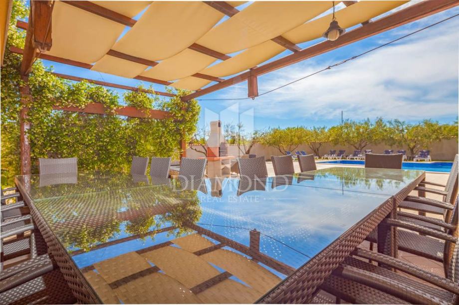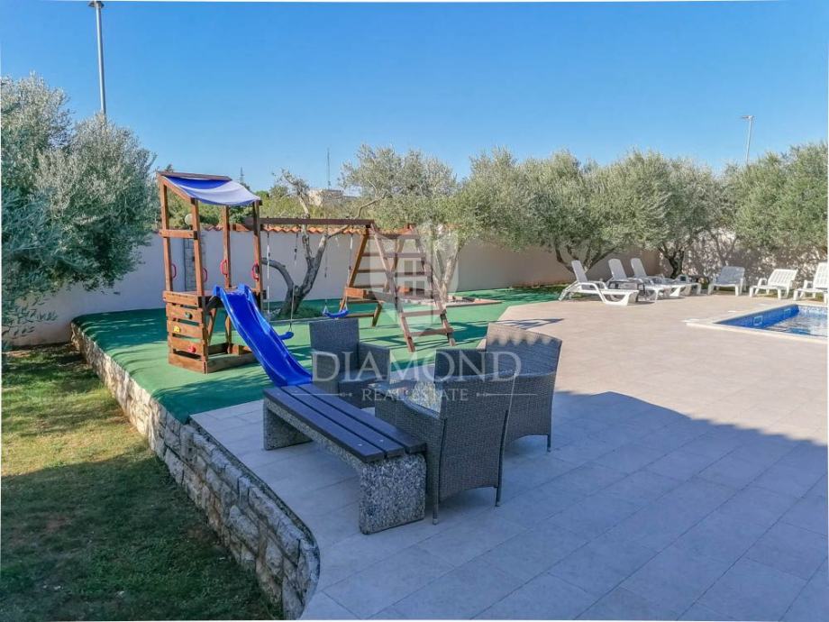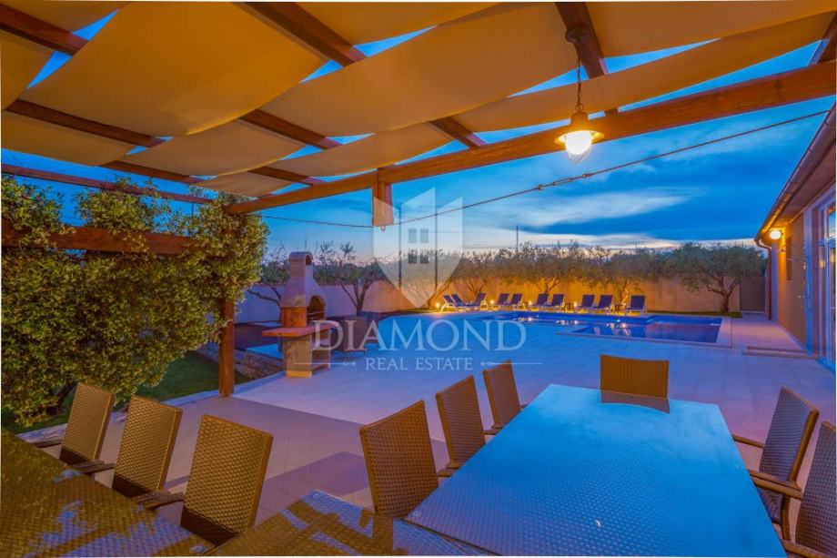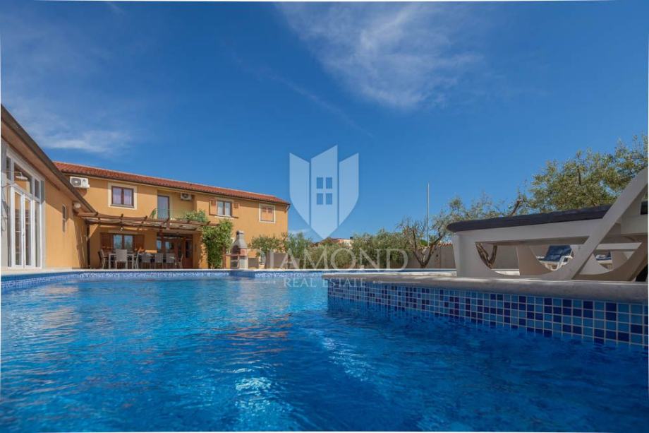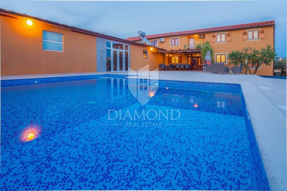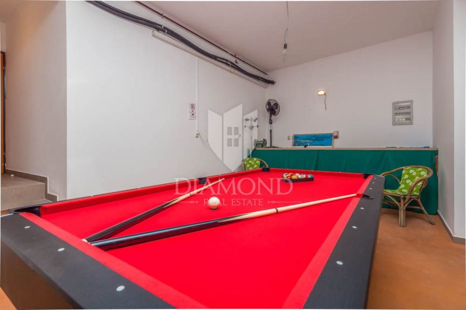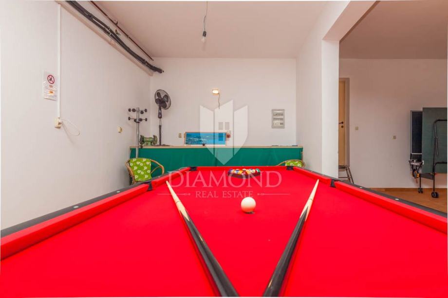 Apartmanska kuća prostire se na 500m2, raspoređenih na prizemlje i prvi kat. Na zatvorenoj parceli od 800m2 nalazi se i 225m2 hala koja može biti pretvorena u zatvoreni wellness prostor povezan s bazenom. Kuća je sada podijeljena na nekoliko jedinica, te sadrži hidromasažni bazen od 50m2, roštilj, dječje igralište i mogućnost wellness zone. Na katu se nalazi stan s tri spavaće sobe i terasom. Dodatno postoje dva zasebna stana - trosobni i jednosobni. U prizemlju se nalaze garaža za četiri auta, igraonica i kotlovnica. Bazen ima 70m2 i opremljen je jacuzzijem i plitkim dijelom za djecu.