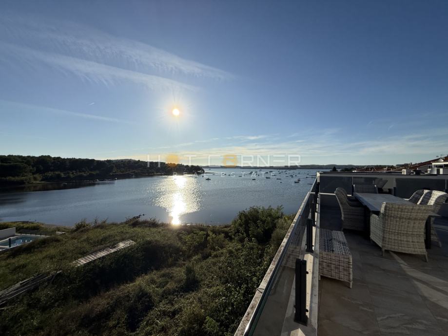 Na fantastičnoj lokaciji, u 1. redu od mora, s otvorenim pogledom na more i medulinsku zaljev sve do Pomera i Premanture, na prodaju je luksuzni penthouse sa krovnom terasom s očaravajućim pogledom.
