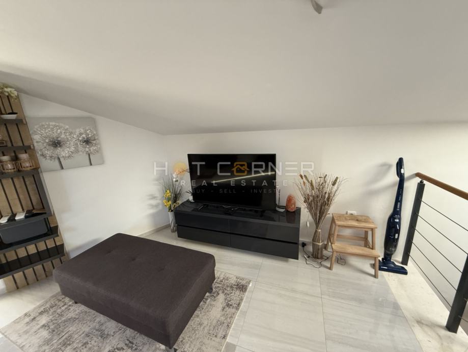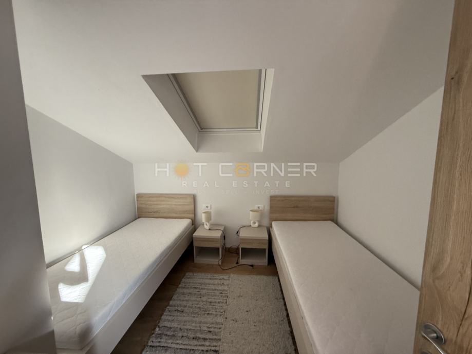 Unutrašnjim stepenicama se ide na gornju etažu, na kojoj se nalazi još jedna, treća spavaća soba, još jedna kupaona, dnevni boravak s kuhinjom i trpezarijom i highlight stana- ogromna krovna terasa površine cirka 40 m2, sa jacuzzijem, roštiljem i panoramskim otvorenim pogledom na more. Stanu pripadaju i dva vanjska parkirna mjesta, od kojih bi se na jednom mogao smjestiti box za bicikle ili slično.