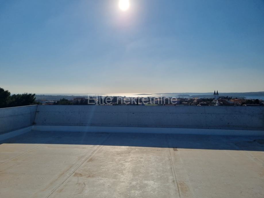 Na prvi kat kuće pristupamo unutarnjim stepeništem te se na katu nalaze četiri spavaće sobe od kojih svaka ima vlastitu kupaonicu,a dvije spavaće sobe imaju izlaz na dugi i prostrani balkon. Prostrana krovna terasa kuće predviđena je kao prostor za druženje,iz kojeg se pruža prekrasan pogled na more. Krovna terasa ( cca 40m2 ) je uredno popločena i ograđena sa jednim od najmodernijih tehnika izolacije, predviđen je i prostor s mini barom za ugodna večernja druženja.