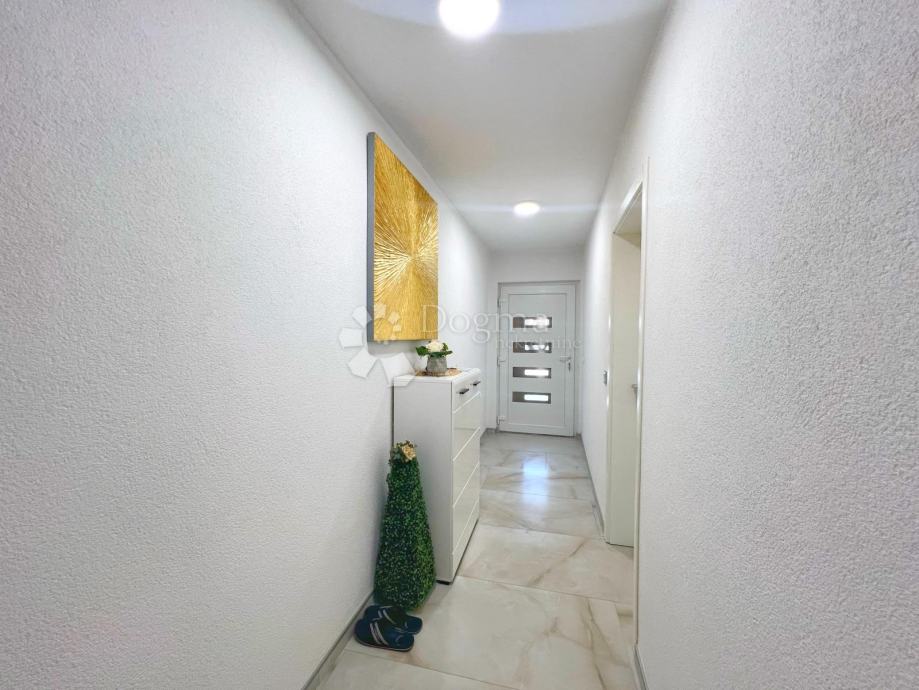 Stan je smješten u prizemlju manje stambene zgrade s ukupno tri jedinice, čime se osigurava dodatna privatnost i mir. Ukupna stambena površina obuhvaća ulazni hodnik, tri spavaće sobe, od kojih dvije imaju vlastite kupaonice, još jednu dodatnu kupaonicu, te dnevni prostor otvorenog koncepta koji objedinjuje kuhinju s ostavom, blagovaonicu i dnevni boravak. Iz dnevnog prostora izlazi se na prostranu natkrivenu terasu – savršeno mjesto za boravak tijekom toplijih mjeseci.