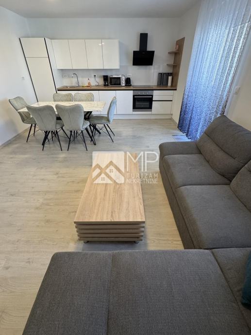 Stan je kompletno namješten i opremljen, s podnim grijanjem u cijelom prostoru, te dolazi s 2 parkirna mjesta (jedno natkriveno, jedno nenatkriveno).