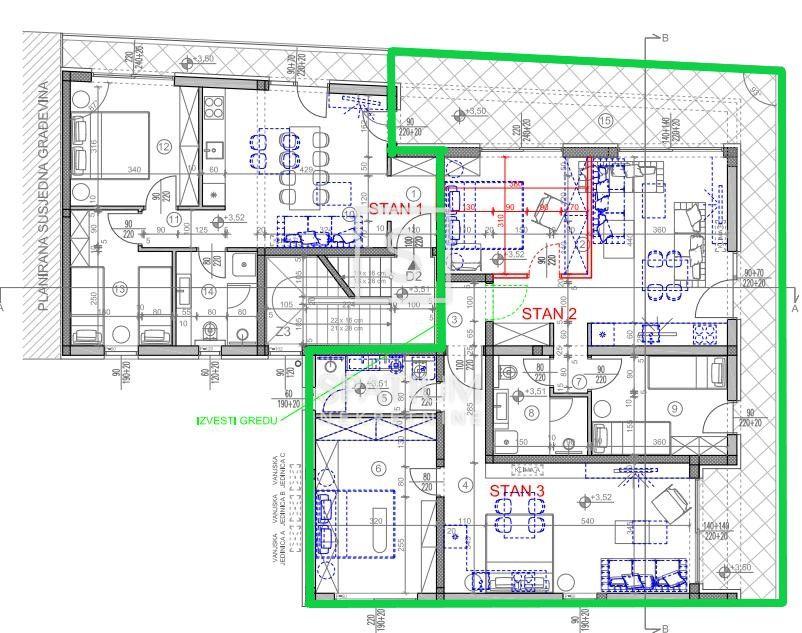 Stanu pripadaju tri parkirna mjesta i spremište u prizemlju zgrade.