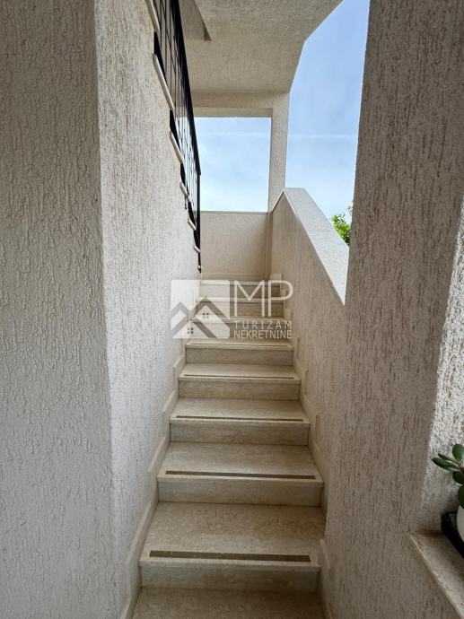 Na prvom katu se nalazi stan površine 75m2 identičnog rasporeda kao prizemni, s razlikom u veličini terase s djelomičnim pogledom na more.
