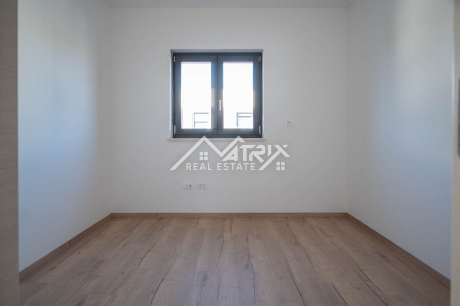 Stolarija je aluminijska u antracit boji s komarnicima, a ukupna izvedba i završna obrada stanova visoke je kvalitete. Uz stan dolazi jedno garažno mjesto i jedno vanjsko parkirno mjesto, što je rijetkost u blizini mora.