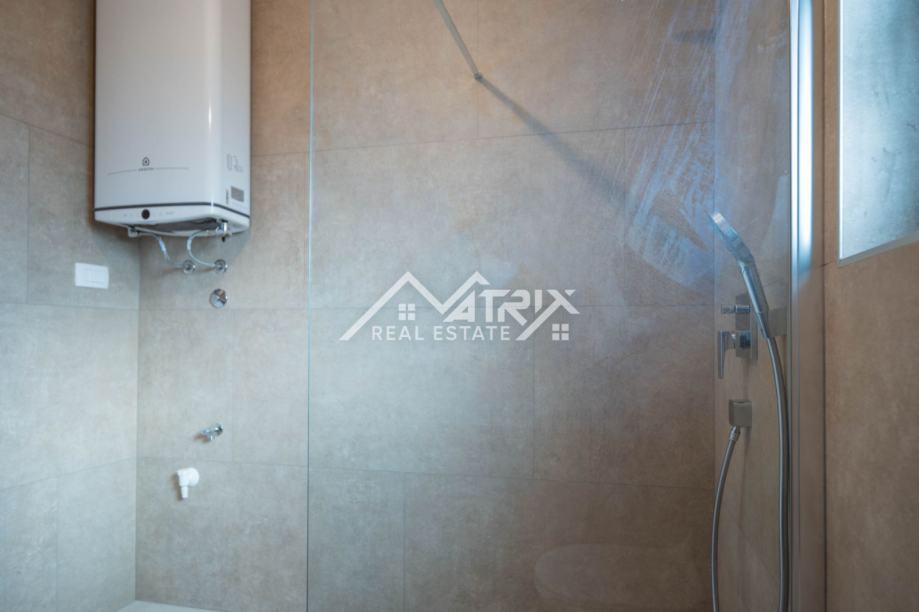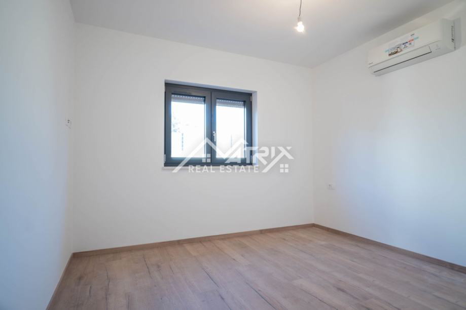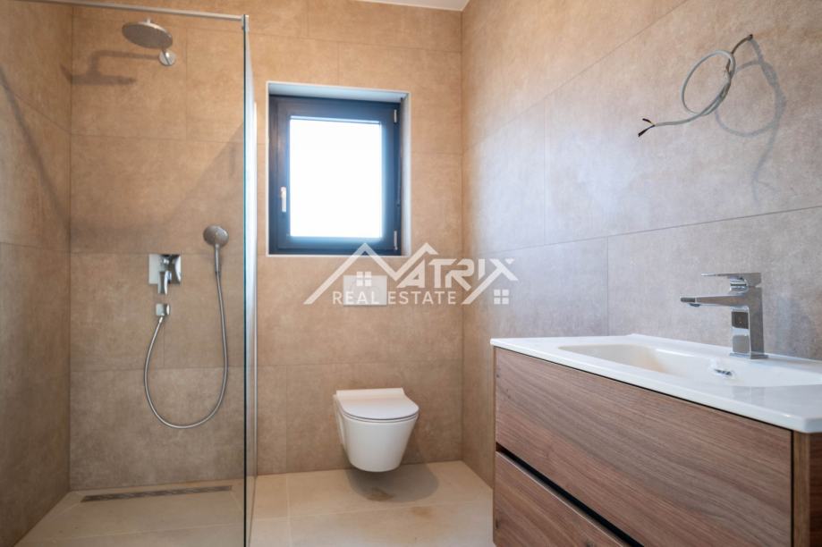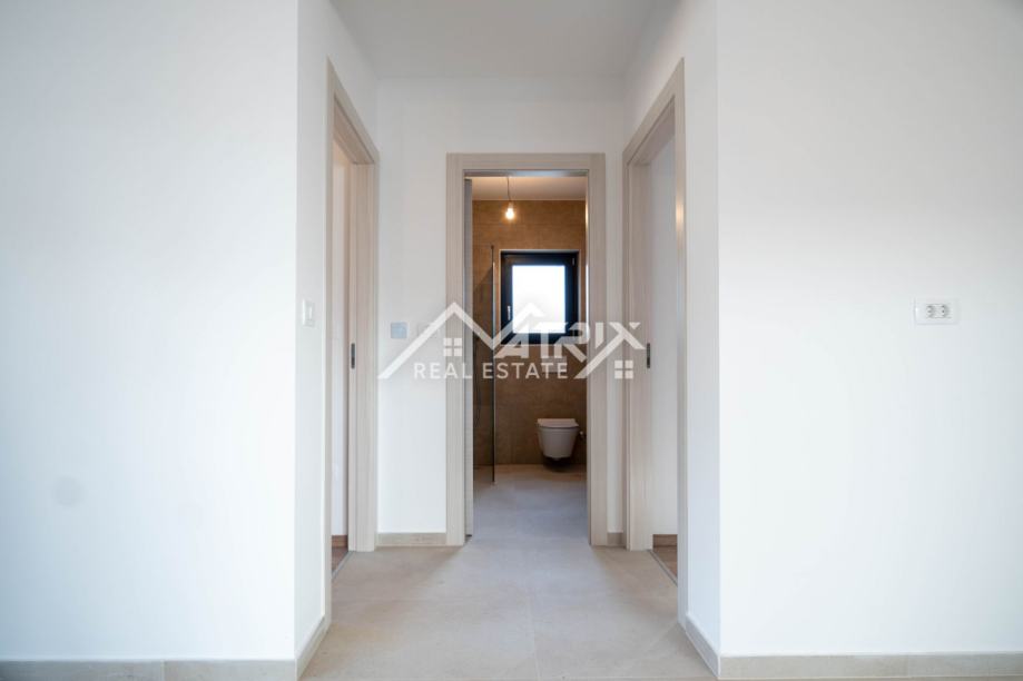 Elegantna aluminijska stolarija u antracit boji dolazi s komarnicima, dok dnevni boravak ima i električne rolete. Podne obloge su keramičke pločice u dnevnim prostorima, a kombinacija materijala jamči dugotrajnost i lako održavanje.