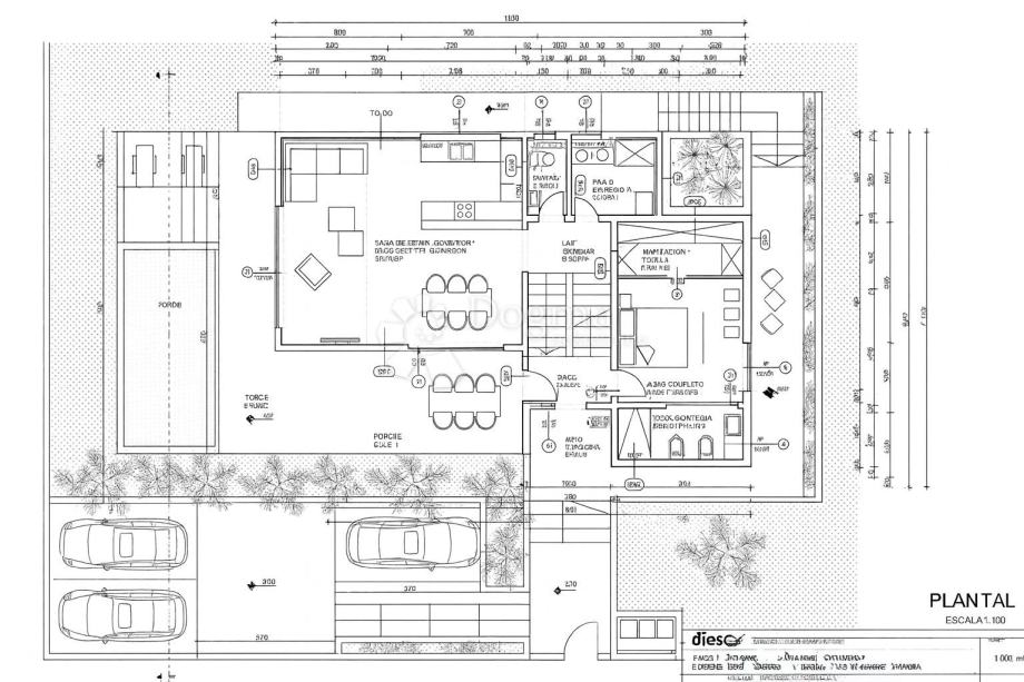 U prizemlju se nalazi veliki dnevni boravak s kuhinjom i blagovaonicom, ispunjen svjetlom zahvaljujući velikim staklenim stijenama koje prostor čine iznimno ugodnim. Iz dnevnog boravka izlazi se na dvije terase te na dio okućnice predviđen za bazen veličine 20 m². Prizemlje dodatno obuhvaća gostinjski toalet, tehničku sobu i hodnik iz kojeg se drvenim stepenicama ide na više etaže.