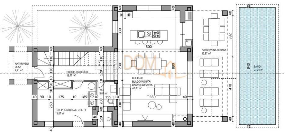 Uz zemljište dolazi i projekt s pravomoćnom građevinskom dozvolom, a komunalni doprinos je već plaćen. Predviđeni projekt uključuje izgradnju katnice s bazenom, ukupne površine od 200 m². Kuća će se sastojati od tri spavaće sobe, dvije kupaonice, prostranog dnevnog boravka s kuhinjom i blagovaonicom, dodatnog WC-a, ostave, terase, kao i vanjskog tuša, kuhinje i sunčališta.