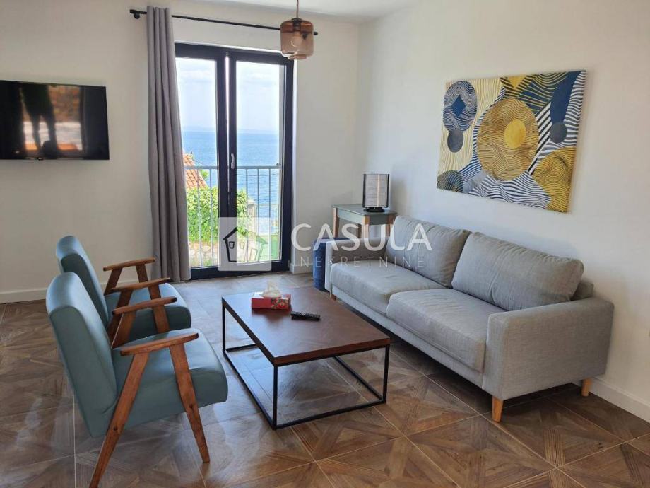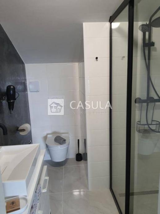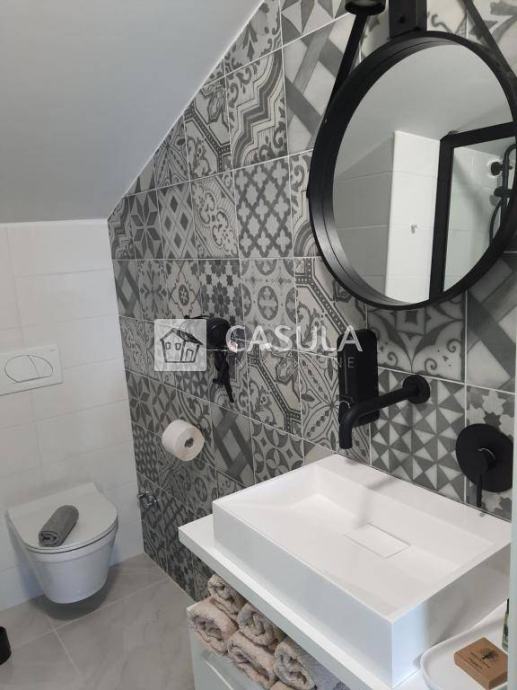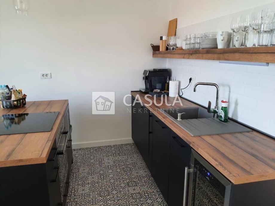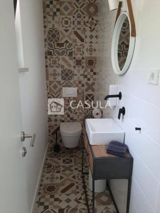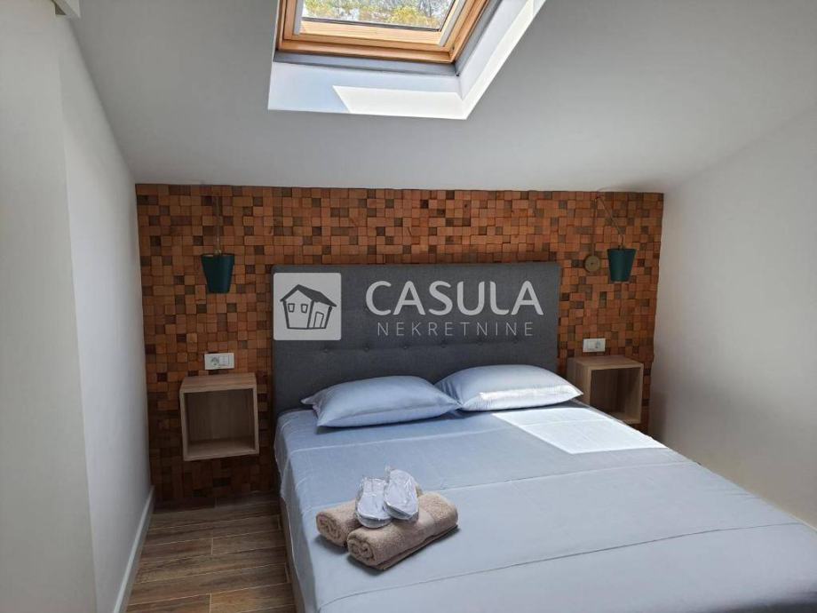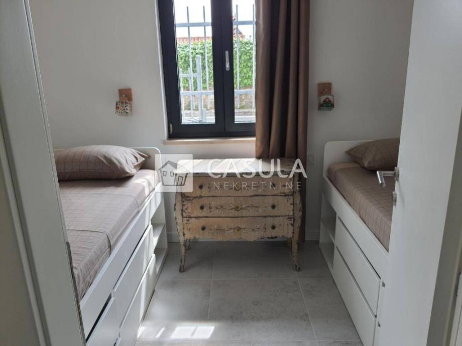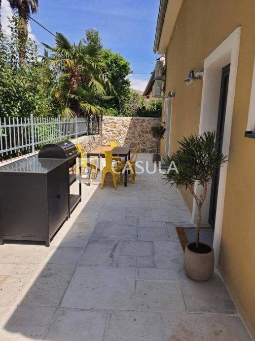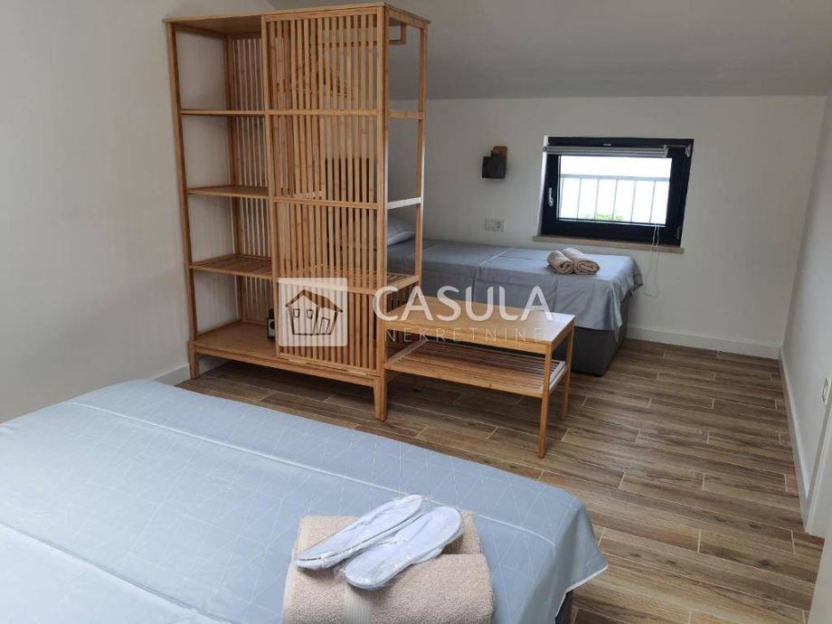 MEDVEJA,Samostojeća kuća na izvanrednoj lokaciji,samo 50 tak m od poznate šljunčane plaže. Kuća je kompletno obnovljena prije 3 godine, sastoji se od tri apartmana koja su u funkciji iznajmljivanja. Na prizemlju koje je površine 71,5 m2 nalazi se dvosobni apartman s dnevnim boravkom, dvije kupaone, kuhinja s blagovaonom i dnevni boravak te manje spremište. Ispred apartmana nalazi se lijepa ograđena terasa. Na gornja dva kata nalaze se identični dvoetažni apartmani , svaki po 71,5 m2. Svaki apartman ima na doljem katu uređenu kuhinju, dnevni boravak i wc a na potkrovlju do kojeg vode unutarnje stepenice nalaze se soba sa bračnim krevetom i jednim pomoćnim krevetom , galerija za još jedan krevet te kupaona. Svi su apartmani uređeni i namješteni. Ispred njih je velika terasa. Svi apartmani imaju klime i podno grijanje te solarni sistem za grijanje vode. Iza kuće je spremište i utility room sa zajedničkim bojlerom i wc površine 37,6 m2.Ispred kuće je parking za 3 automobila. Pogled na more.