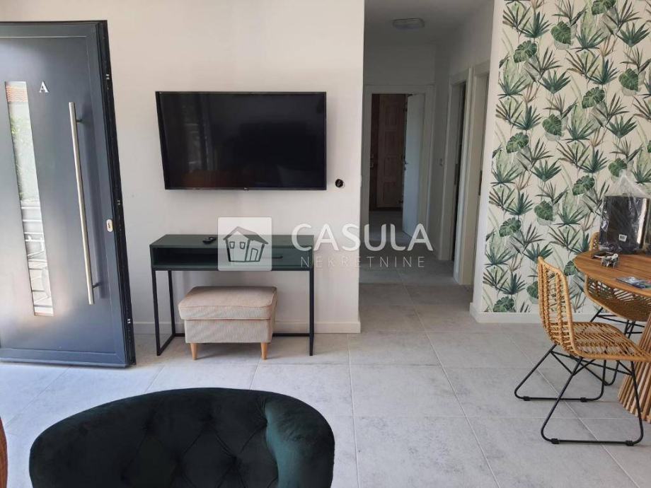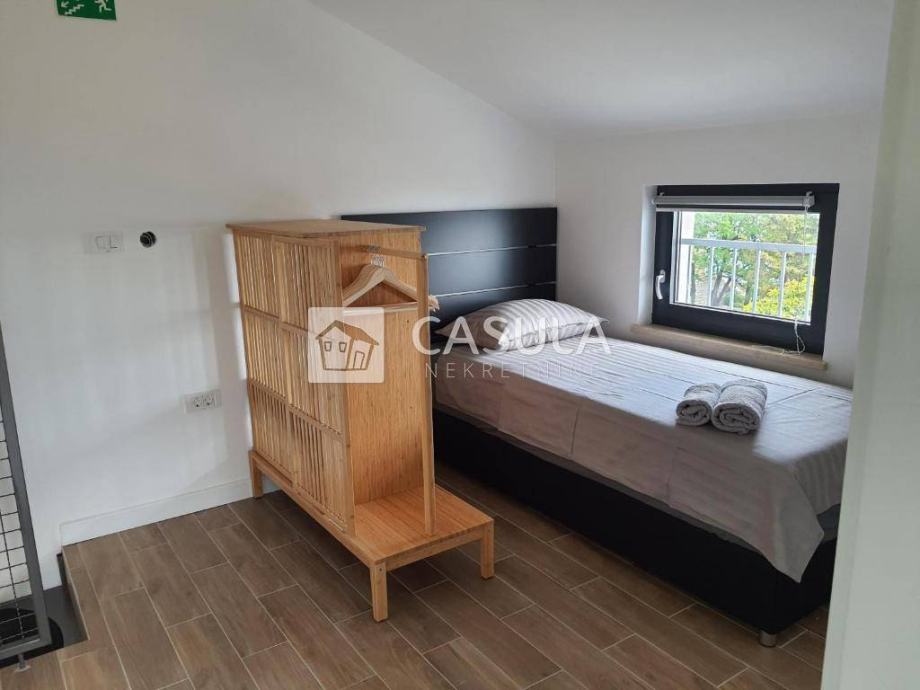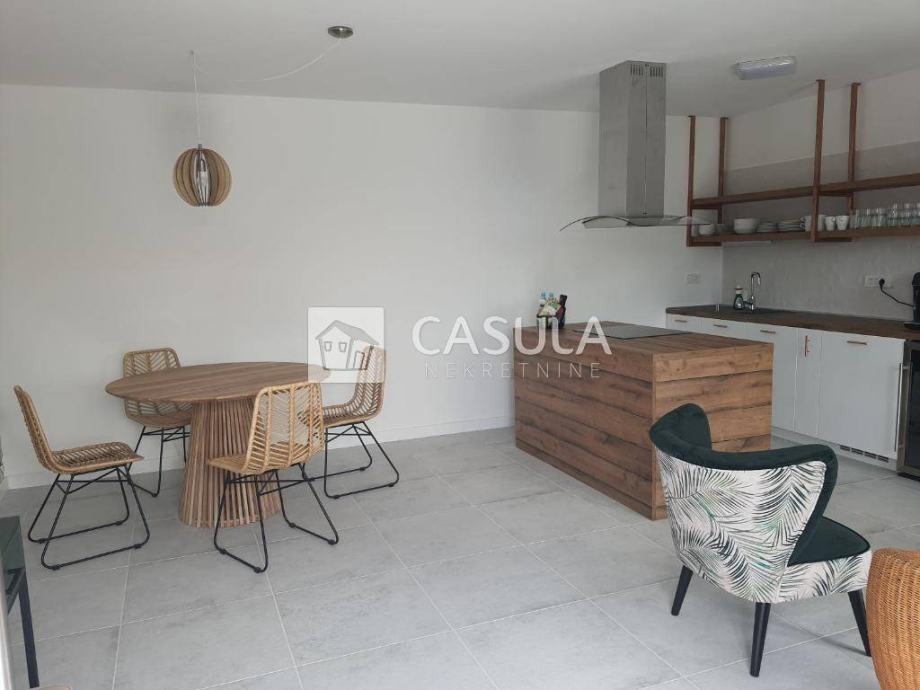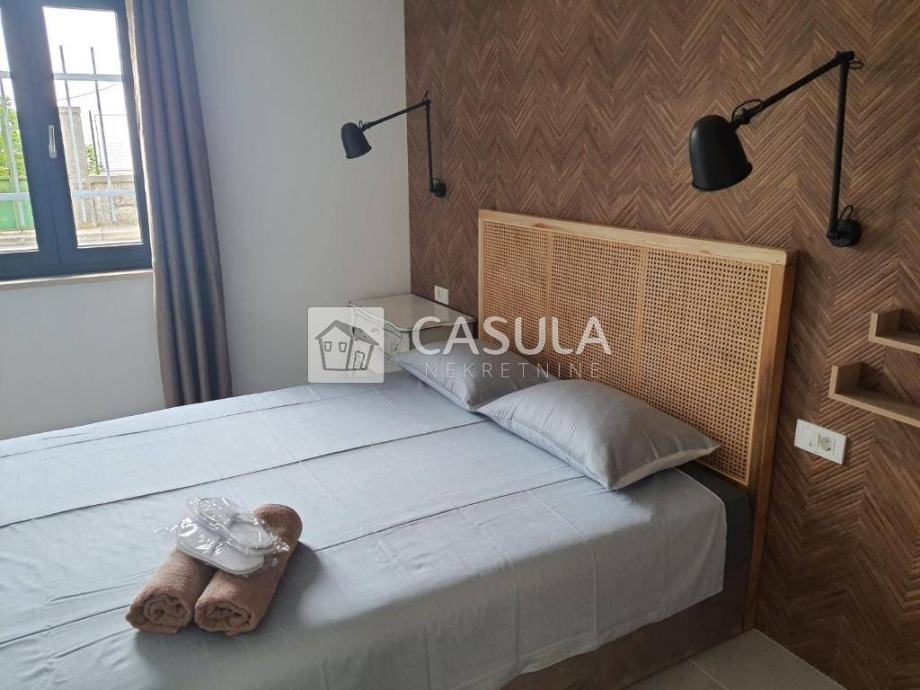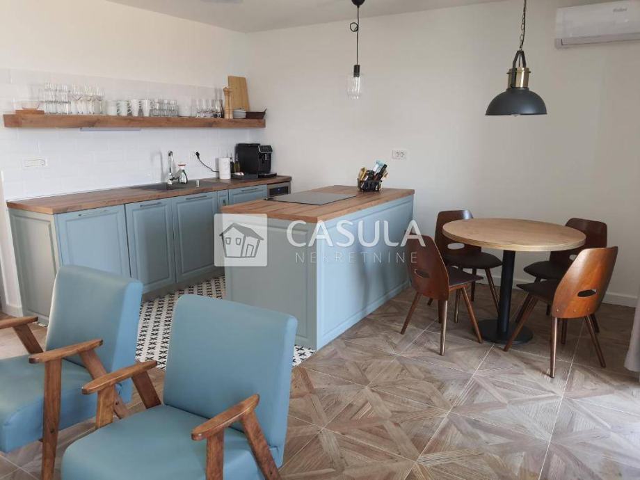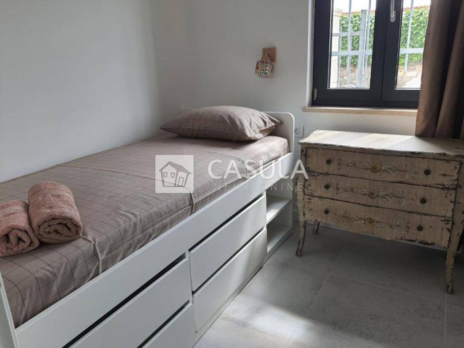 MEDVEJA,Samostojeća kuća na izvanrednoj lokaciji,samo 50 tak m od poznate šljunčane plaže. Kuća je kompletno obnovljena prije 3 godine, sastoji se od tri apartmana koja su u funkciji iznajmljivanja. Na prizemlju koje je površine 71,5 m2 nalazi se dvosobni apartman s dnevnim boravkom, dvije kupaone, kuhinja s blagovaonom i dnevni boravak te manje spremište. Ispred apartmana nalazi se lijepa ograđena terasa. Na gornja dva kata nalaze se identični dvoetažni apartmani , svaki po 71,5 m2. Svaki apartman ima na doljem katu uređenu kuhinju, dnevni boravak i wc a na potkrovlju do kojeg vode unutarnje stepenice nalaze se soba sa bračnim krevetom i jednim pomoćnim krevetom , galerija za još jedan krevet te kupaona. Svi su apartmani uređeni i namješteni. Ispred njih je velika terasa. Svi apartmani imaju klime i podno grijanje te solarni sistem za grijanje vode. Iza kuće je spremište i utility room sa zajedničkim bojlerom i wc površine 37,6 m2.Ispred kuće je parking za 3 automobila. Pogled na more.
