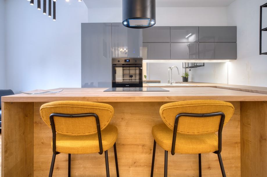Stan je u potpunosti opremljen i spreman za useljenje, a raspored uključuje veliki boravak s prekrasnim trosjedom, bogato opremljenu kuhinju s blagovaonom, jednu spavaću sobu s bračnim krevetom i balkonom, drugu spavaću sobu s radnim mjestom, dvije moderne kupaonice s tušem i WC-om, walk-in garderobu / spremište i namještenu loggiu za opuštanje. Ogromno dizajnersko predsoblje s mjestom za druženje spaja sve dijelove stana na originalan način.