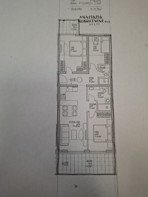 Trosoban komforan stan ukupne obračunske površine površine 75.79 m2 m2 na 2.katu s liftom a sastoji se od ulaznog hodnika 3 sobe ,dnevnog dijela s kuhinjom, dva sanitarna čvora lođe i veće terase.