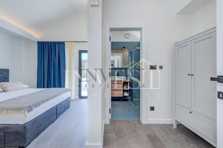 Na katu se nalaze tri spavaće sobe i tri kupaonice. Središnje spavaće sobe su orijentirane na vanjsku terasu. Villu prate čiste linije, neopterećenost bojama, pomno birana rasvjeta, te namještaj koji se stapa s prirodom.