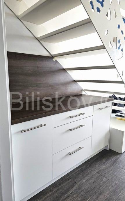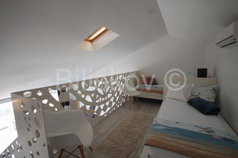 Omiška Rivijera, Mimice - lijepo i moderno uređen dvosoban stan s pogledom na moreU elegantnoj zgradi prodajemo dvosoban stan 87m2 (obračunato s terasom, parkingom i spremom po koeficijentu).Stan se nalazi na 4. katu (zadnjem) u zgadi s liftom.Stan se sastoji od kuhinje po mjeri s modernim uređajima i velikim hladnjakom, dnevnim boravkom s galerijom, spavaće sobe s vlastitom kupaonicom, manje sobe koja se nalazi na galeriji, velike kupaonice, prostrane lijepe terase koja se potpuno prekriva s motornom tendom koja se uvlači u kutiju i manje lođe.Termo zavjese na prozorima štite od topline i jakog sunca.Svaka soba ima klima uređaj.Ograda na galeriji je u obliku paške čipke, umjetničke slike na zidovima i neobično izveden krov galeriji koji podsjeća na unutrašnjost male kućice su samo neki od detalja koji ovaj stan čine posebnim i čime se on razlikuje od većine stanova na tržištu.Stan je lijepo uređen i prodaje se kompletno namješten.Iz garaže je prilaz stanu omogućen liftom.Uz stan se prodaje i jedno parkirno mjesto u podzemnoj garaži.U zajedničko vlasništvo zgrade pripada grijani bazen i jacuzzi iz kojih se pruža opuštajući pogled na more.Također u zajedničkom vlasništvu zgrade je mjesto za roštilj, vanjski tuš i vešeraj.Stan je idealan za bavljenje turističkim najmom, svi vlasnici rade s jednom agencijom koja je u prizemlju ima recepciju za usluge turistima.