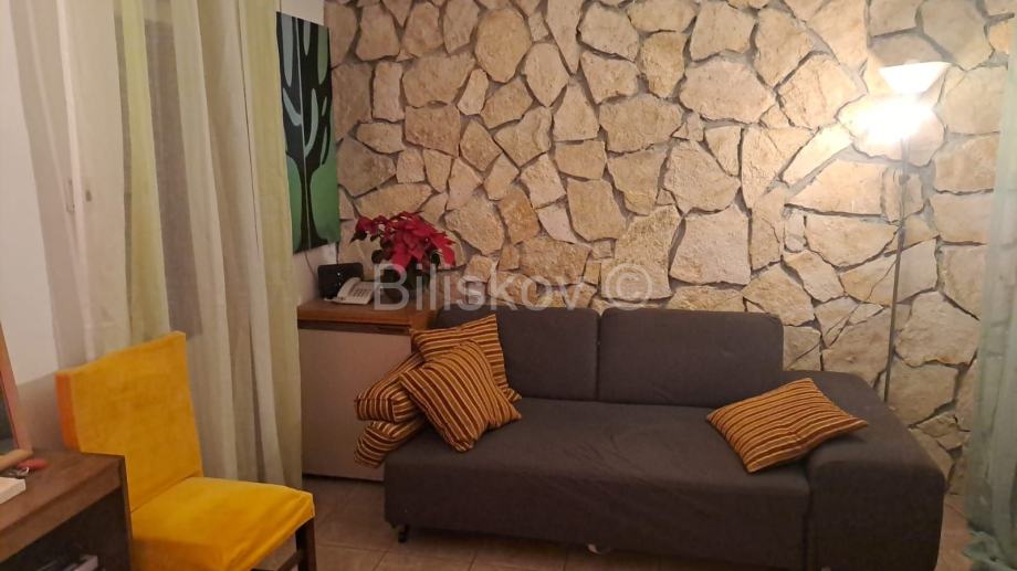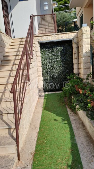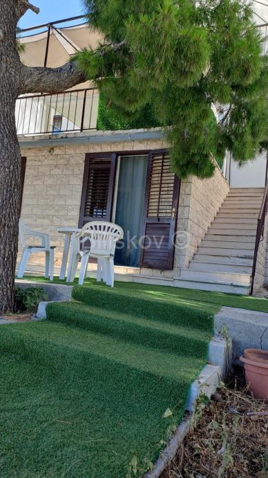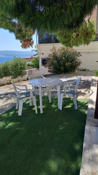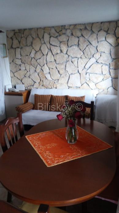 Mimice, prostran studio apartman površine 30m2 s pomoćnom prostorijom površine 12m2 izvana i vanjskim dodatnim WC-om na prizemlju kuće. Ispred stana je terasa cca 15m2 s koje se pruža pogled na more.