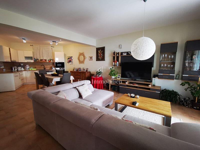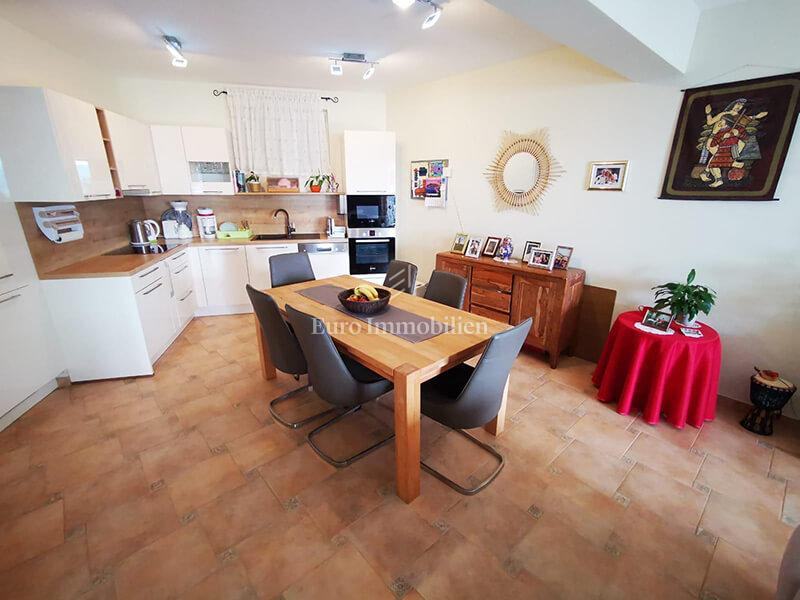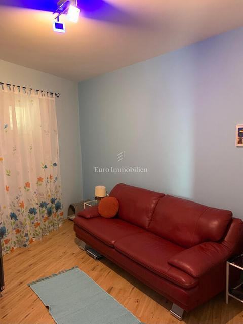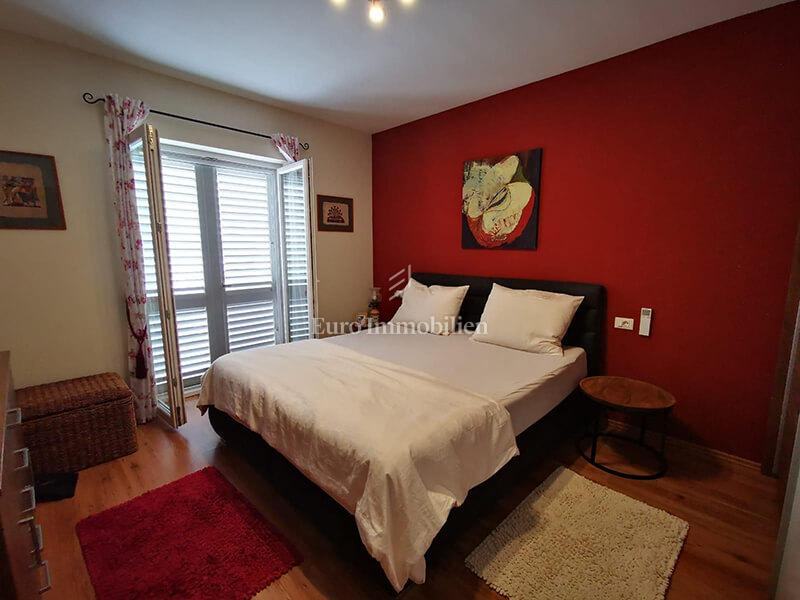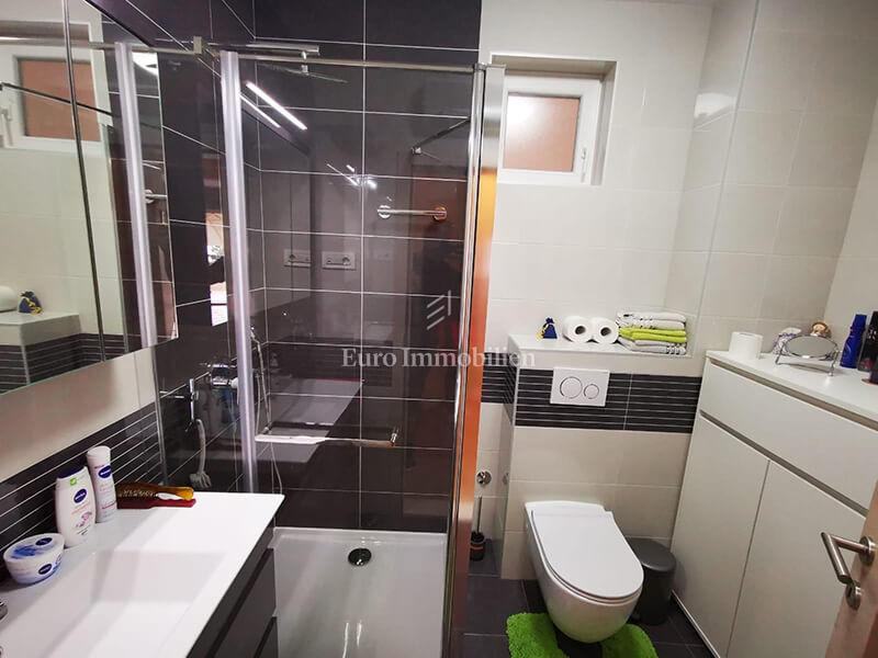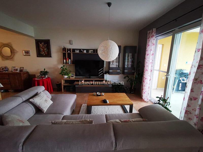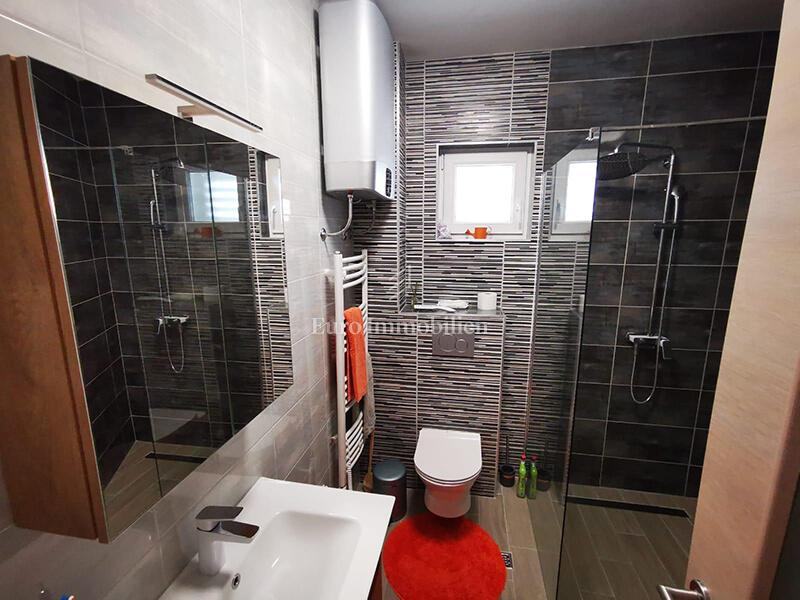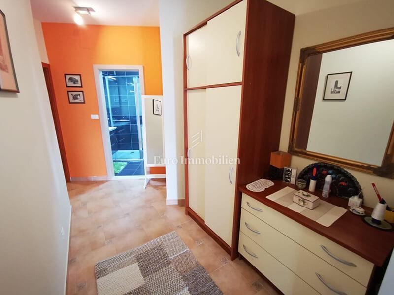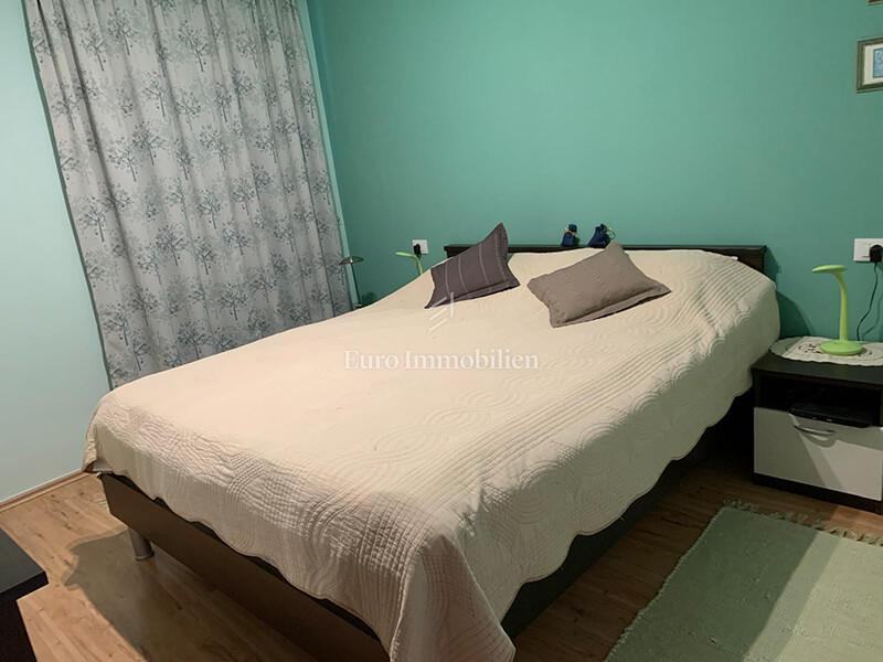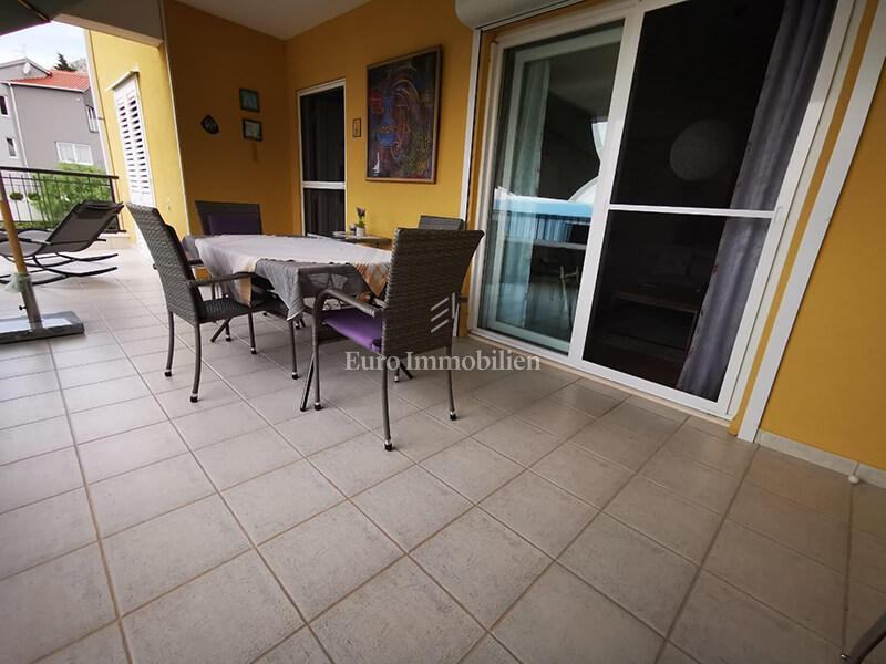 Stan se nalazi na prvom katu urbane vile novije gradnje. Nekretnina ima površinu od 116,25 m2, a sastoji se od tri spavaće sobe, hodnika, ostave, dvije kupaonice, kuhinje s blagovaonicom, dnevnog boravka, balkona površine 7,12 m2 i prostrane lođe površine 19,39 m2 koje pružaju prekrasan pogled na more. U cijenu stana uključeno je i vanjsko parkirno mjesto. Stan je odmah useljiv, potpuno namješten i klimatiziran te se takav i prodaje. U prizemlju zgrade se nalazi prostrani vanjski bazen sa sunčalištem koji koriste svi stanari zgrade. Zgrada je udaljena cca 300 metara od mora i prekrasne šljunčane plaže.