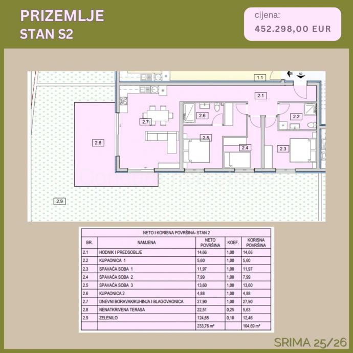 Stan S2- nalazi se u prizemlj, ukupne korisne površine 107,69 m2 (stambena površina 86,60 m2 + terasa 22,51 m2 + vrt 124,65 m2 + parking) nalazi se u prizemlju. Sastoji se od hodnika, predsoblja, dvije kupaonice, tri spavaće sobe, kuhinje s blagovaonicom, dnevnog boravka s izlazom na lijepu nenatkrivenu terasu površine 22,51 m2 i prostran vrt površine 124,65 m2. Stanu pripada 1 parkirno mjesto