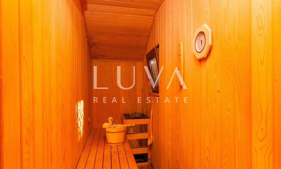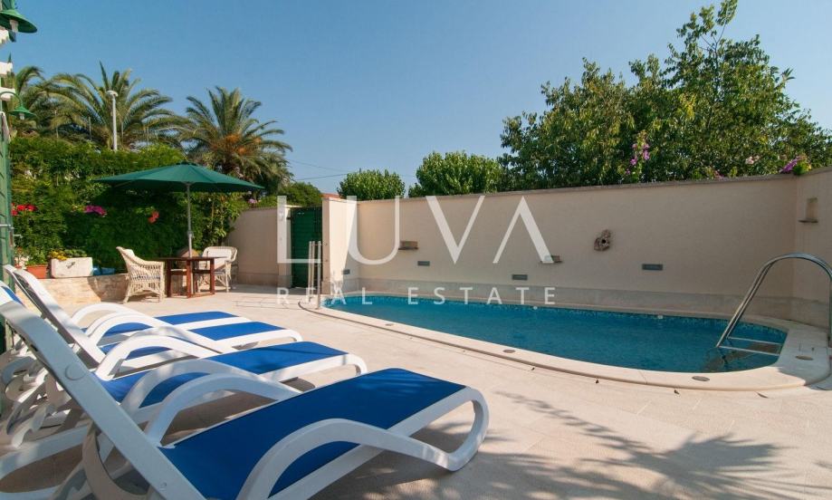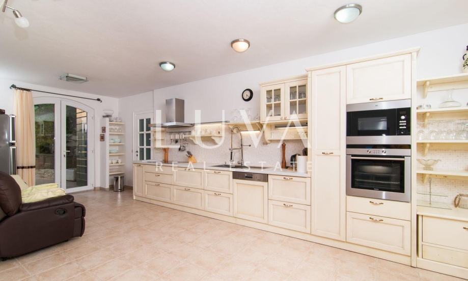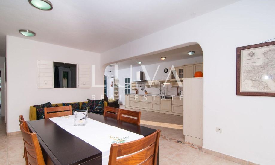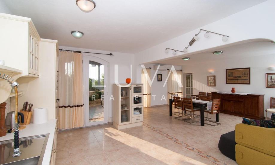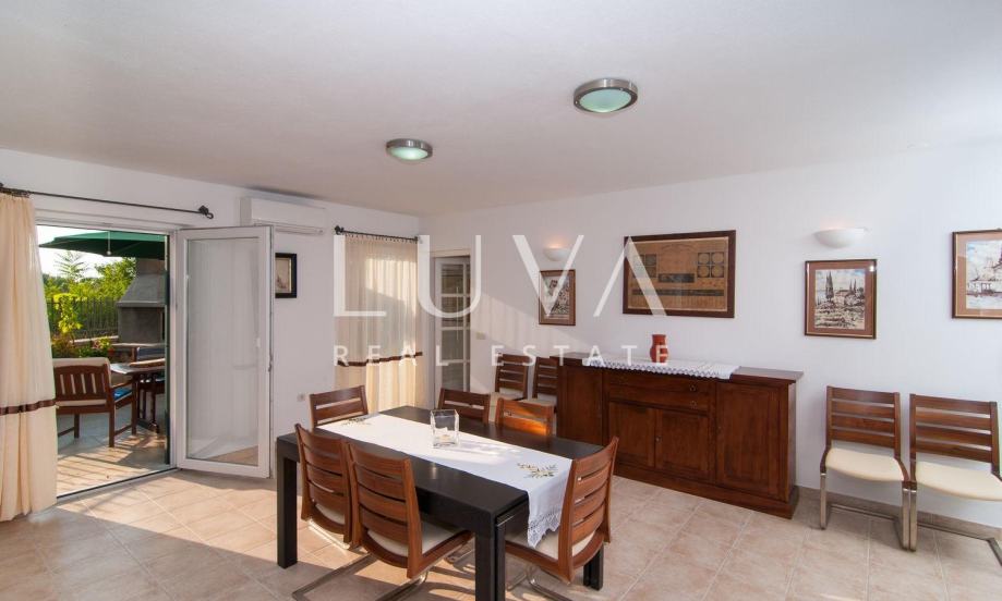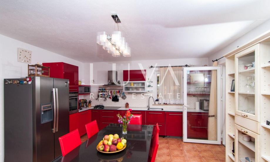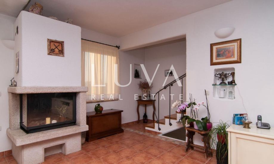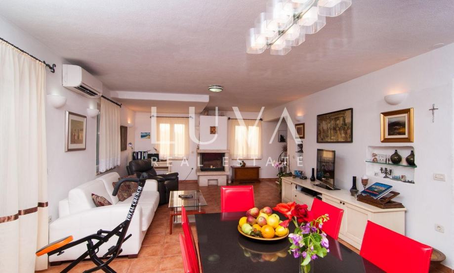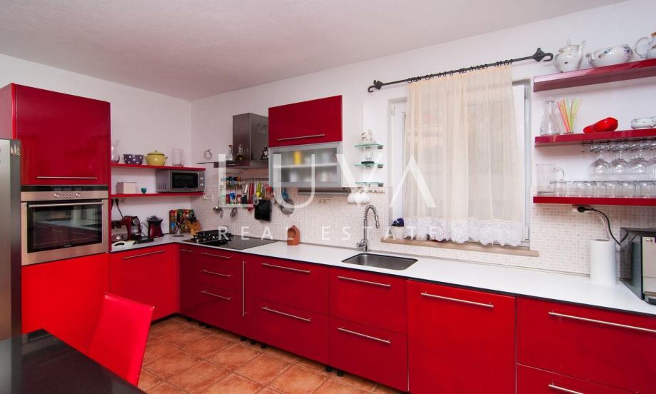 Unutarnji prostor kuće raspoređen je tako da nudi optimalnu funkcionalnost i privatnost. U prizemlju se nalazi prostrani dnevni boravak s kuhinjom i blagovaonicom u otvorenom konceptu, dodatni toalet te izlaz na veliku terasu s bazenom, idealnu za uživanje tijekom toplih dana. Na prvom katu smještene su dvije spavaće sobe, svaka s vlastitom kupaonicom i bračnim krevetom, dok se na donjoj etaži nalaze dodatne dvije spavaće sobe, dvije kupaonice, dnevni prostor te dvije otvorene terase koje omogućuju dodatni vanjski boravak i privatnost.