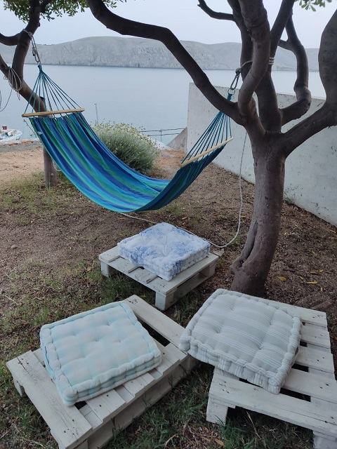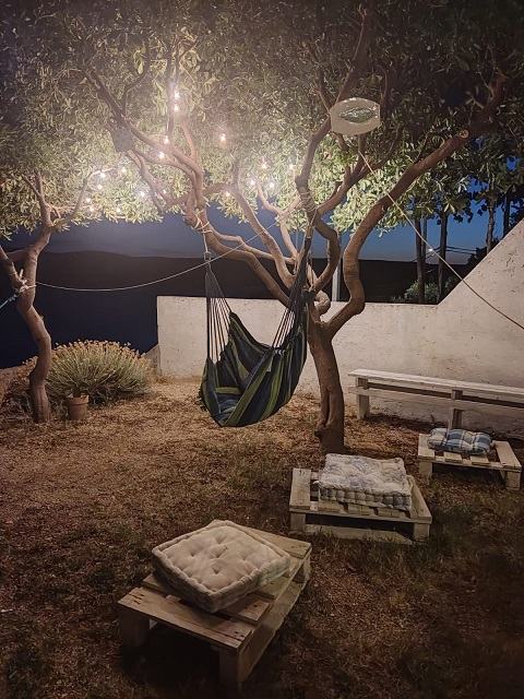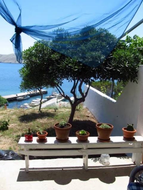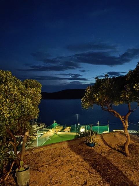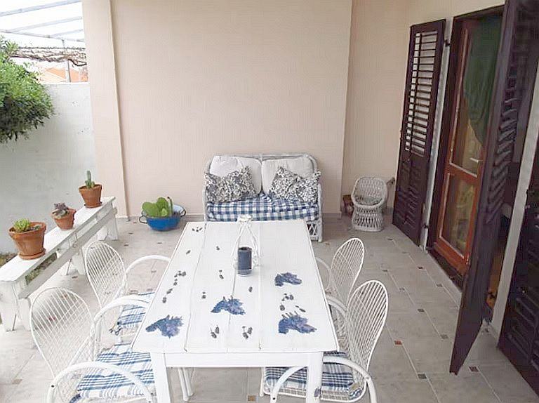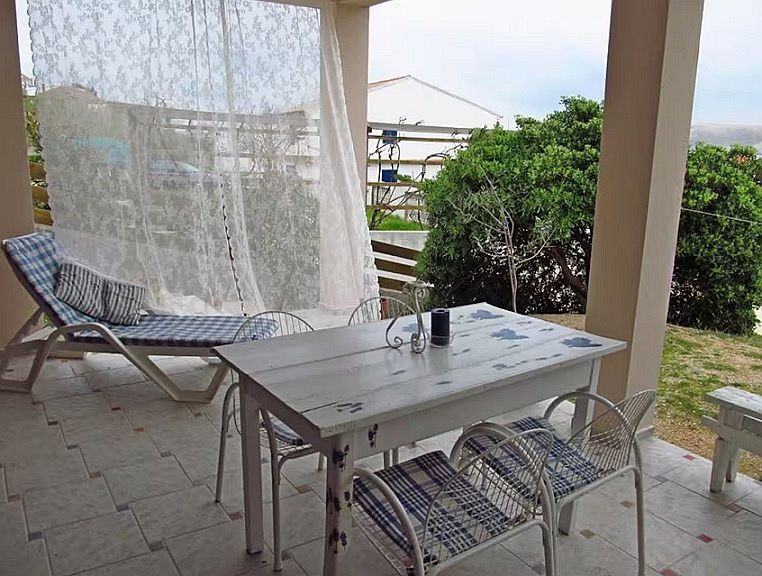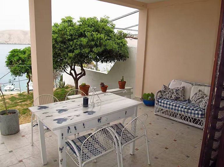 Ispred apartmana je velika natkrivena terasa s pogledom na more i uređeno dvorište.