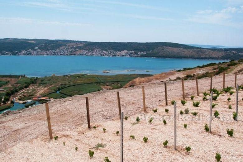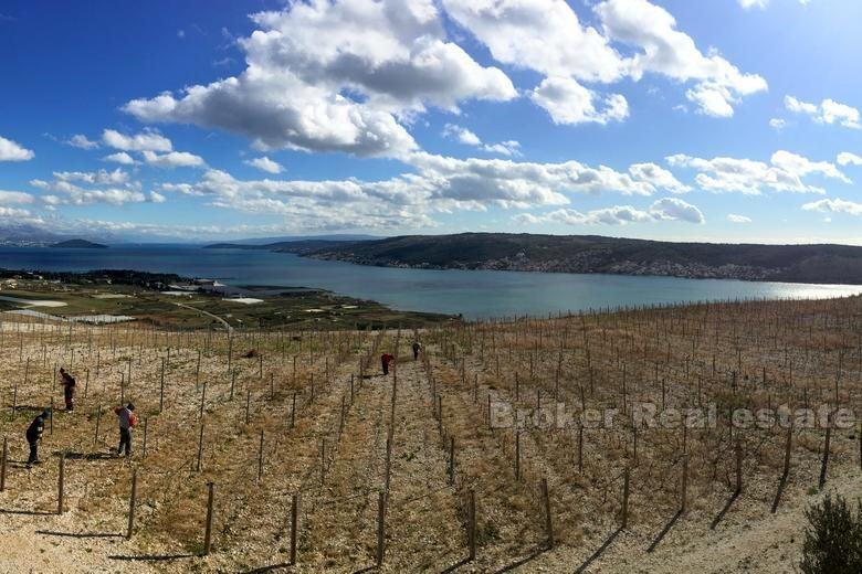 Poljoprivredno kultivirano zemljište 13600 m2 pretvoreno u mladi vinograd, smješten na južnim obroncima UNESCO grada Trogira. Sa zemljišta se pruža fascinatni pogled prema moru i cijelom trogirskom arhipelagu.