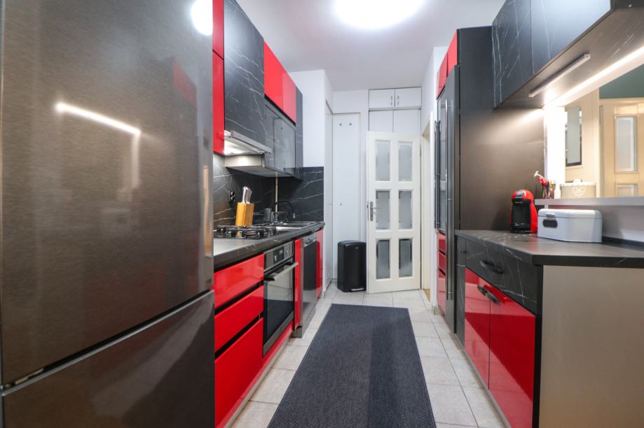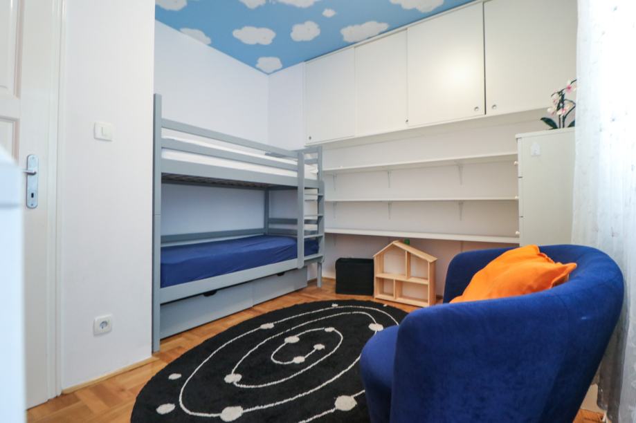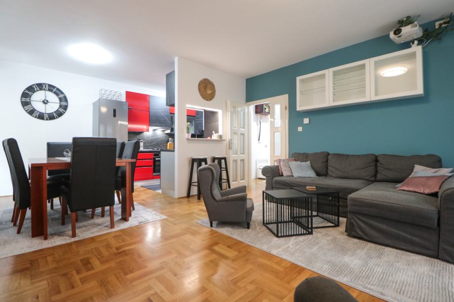 Kompletno je namješten i u cijelosti opremljen - klima uređaj, video projektor, perilica posuđa, perilica rublja, hladnjak sa zamrzivačem, pećnica, 3+1 štednjak, napa, mikrovalna pećnica, aparat za kavu, čaše & posuđe, bračni krevet, dječji krevet na kat, kauč, blagovaonski stol, radni stol, video portafon, protuprovalna vrata, PVC stolarija, alarmni sistem, itd. Prostor je odlično iskorišten ugradbenim ormarima i ormarićima, a u kuhinji je ugrađena i manja ostava.