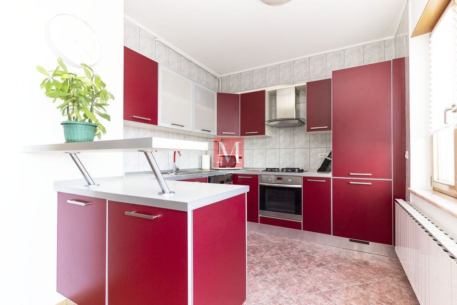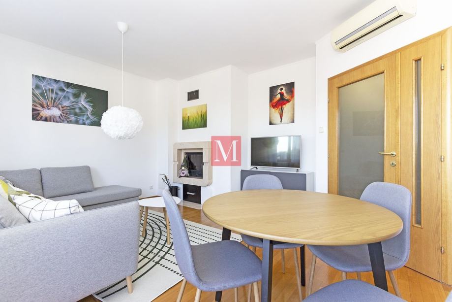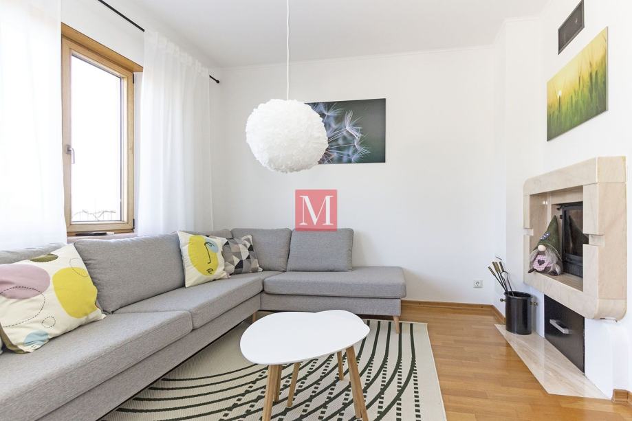 Stan je potpuno namještajem ugradbenim ormarima, svim potrebnim kućanskim aparatima, ima 2 klima jedinice, kamin u dnevnom boravku, protuprovalna vrata i portafon.