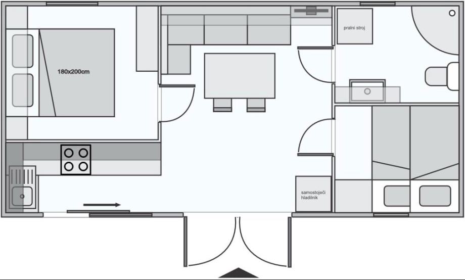 Prostorije: dnevni boravak s blagovaonicom i kuhinjom sa svim potrebnim uređajima, 2 spavaće sobe, 1 kupaonica s tuš kabinom i WC-om.