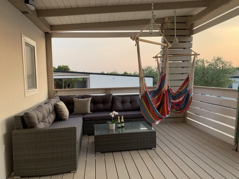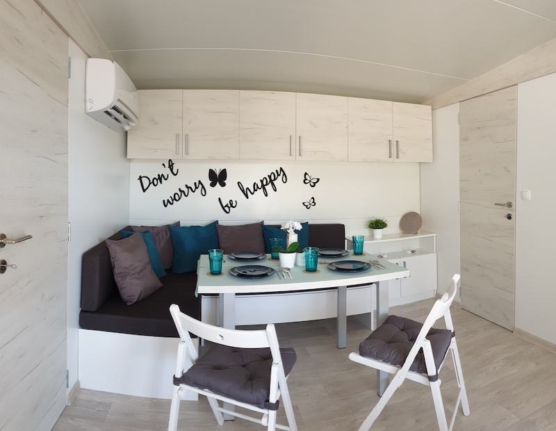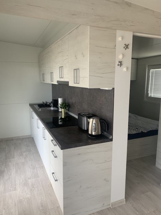 - dnevni boravak s klimom, kutnom garniturom i kuhinjom sa svim potrebnim aparatima (aparat za kavu, toster, kuhalo za vodu, usisavač itd.).