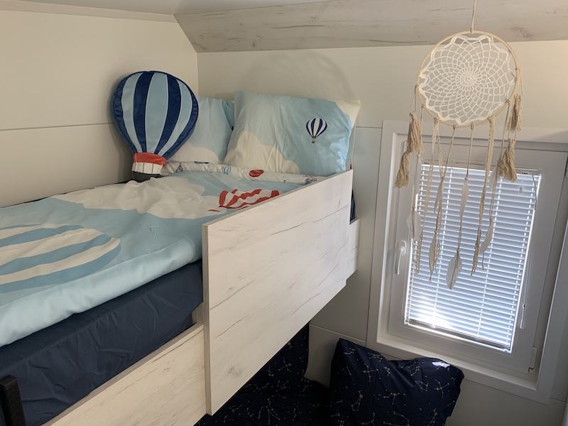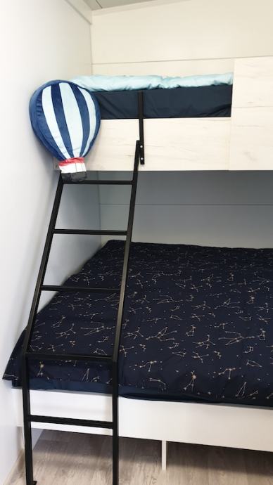 - soba s jednim krevetom na kat 90x200cm i odvojenim krevetom 160x200cm ispod + ormar.