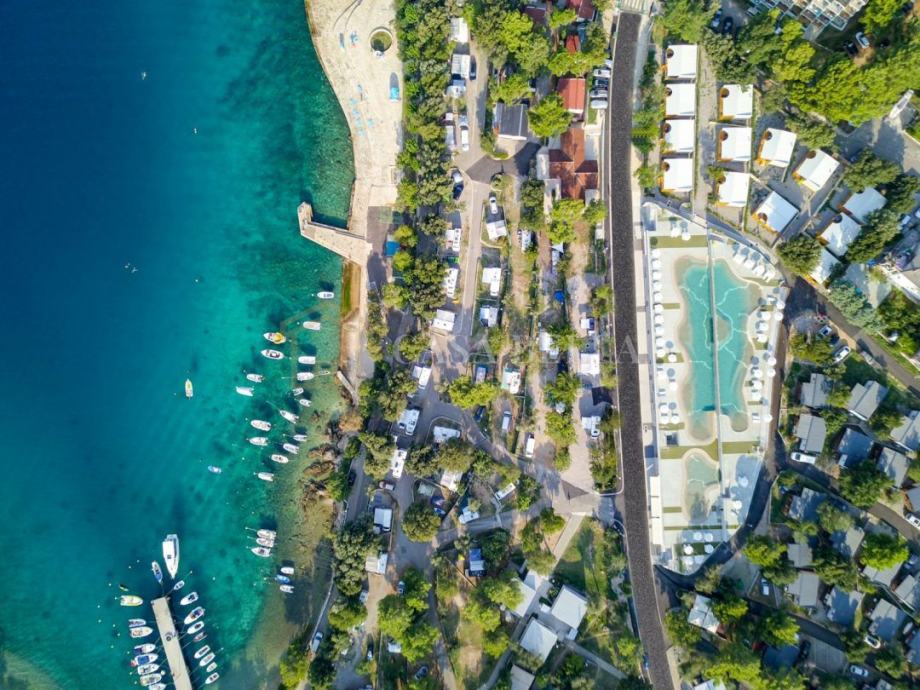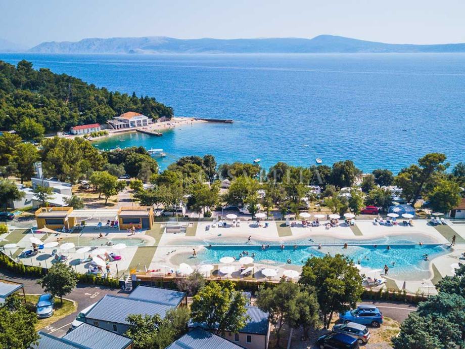 Kamp je okružen zelenilom i bujnom mediteranskom vegetacijom, a fokalnu točku predstavlja vanjski bazenski kompleks na dvije kaskade, koji se nalazi u neposrednoj blizini mora, a tu je i bazen za najmlađe s brojnim popratnim sadržajima.