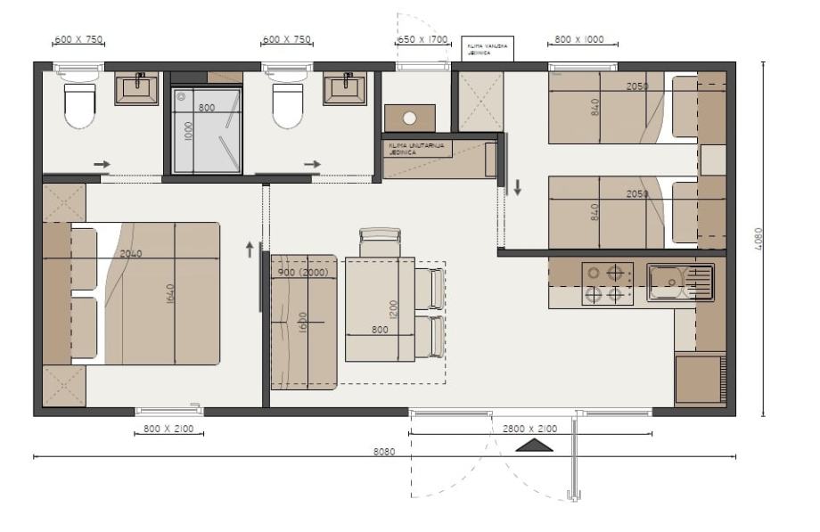 tlocrtna dimenzija 8,1 x 4,1 m, (bračna soba, dječja soba, kuhinja, dnevni boravak, kupatilo).
