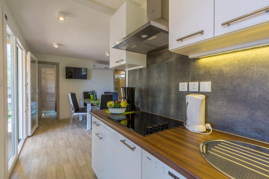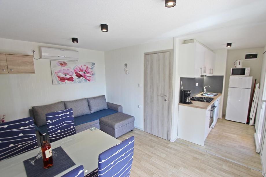 Unutarnji prostor: 34 m²Dimenzije: 800x430cmKapacitet: do 5 osobaSpavaće sobe: 2Kupaonice: 2Dodatni ležaj: Sofa na razvlačenjeKuhinja: Potpuno opremljenaUređaji: Klimatizacija, TV (LG ili Samsung), Wi-Fi
