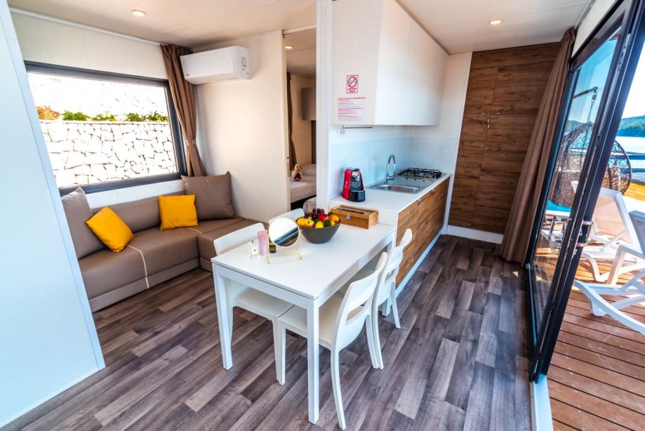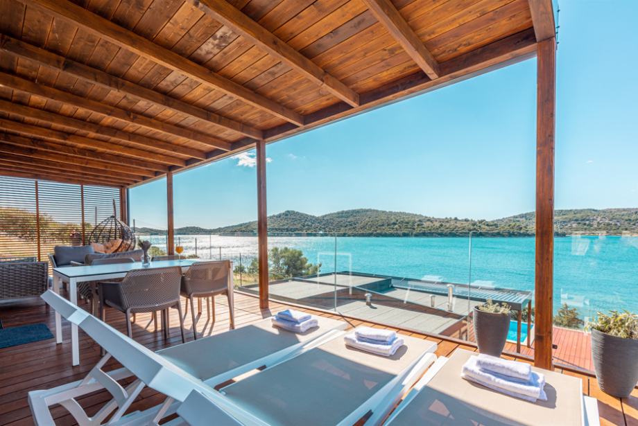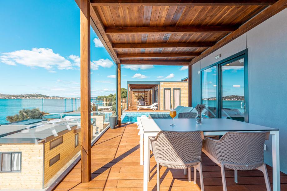 Visokokvalitetna oprema – kućice su opremljene vrhunskim namještajem, uključujući setove za sjedenje, stol sa stolicama i ležaljke.