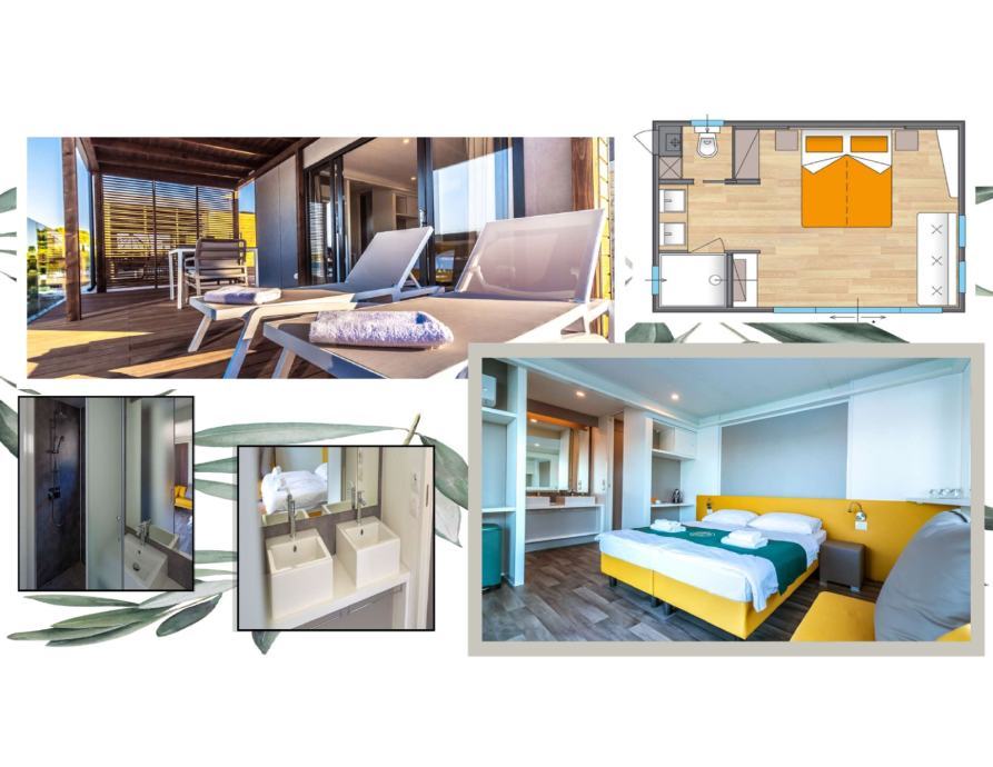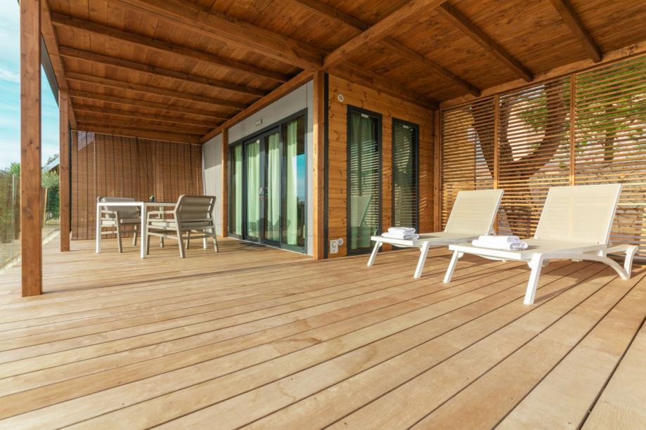 Visokokvalitetna oprema – kućice su opremljene vrhunskim namještajem, uključujući vanjski i unutarnji set za sjedenje i ležaljke.