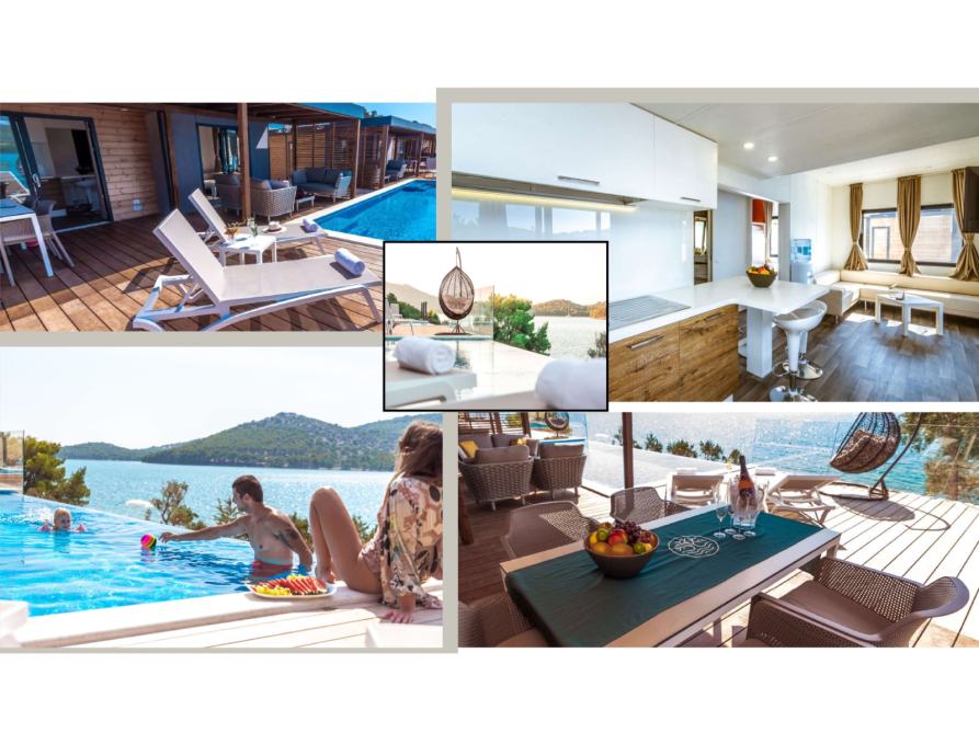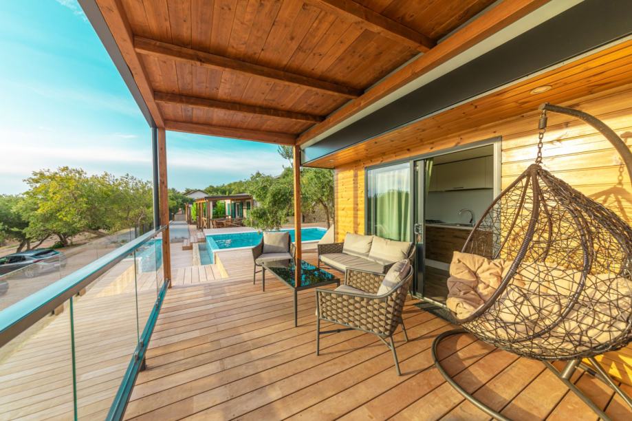 Visokokvalitetna oprema – kućice su opremljene vrhunskim namještajem, uključujući setove za sjedenje, stol sa stolicama, ležaljke i luksuzne ljuljačke “jaje”.
