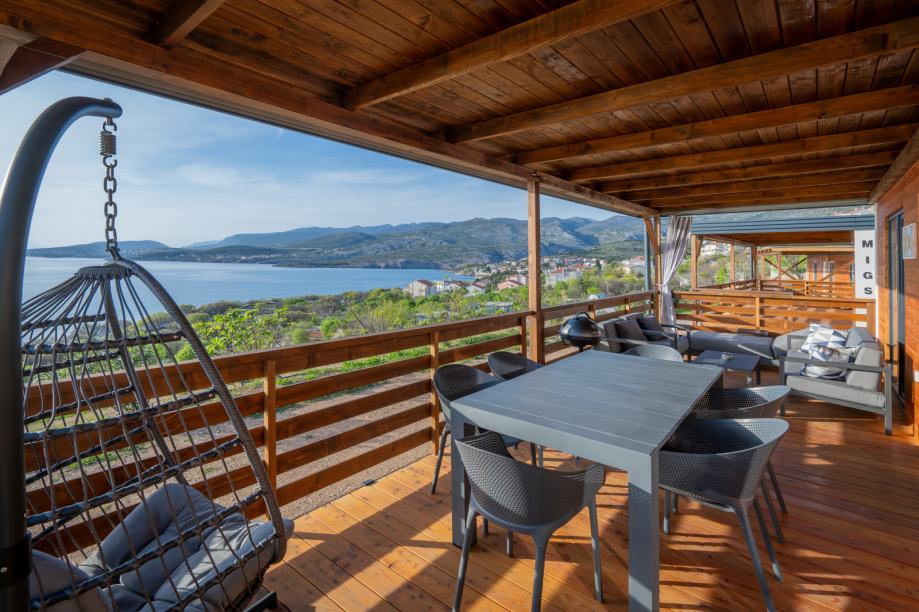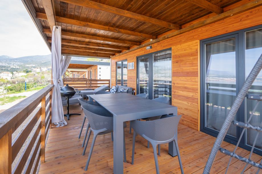 Kućica je veličine 36m2 s predivnom terasom od 27m2. Predivan pogled na more i otok Krk. Dvije spavaće sobe (svaka sa svojom kupaonom), dnevni boravak i kuhinja. Udaljenost od plaže 100m. Uključuje i jedno parkirno mjesto i pripadajući namještaj i opremu (klima, plin, 2x TV, bojler, perilica suđa, frižider, mikrovalna, caffe aparat, kuhalo, potpuni ostali kuhinjski pribor i posuđe).