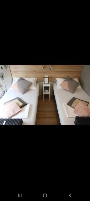 Ima 2 spavaće sobe, jedna sa velikim krevetom, a druga sa 2 manja kreveta.